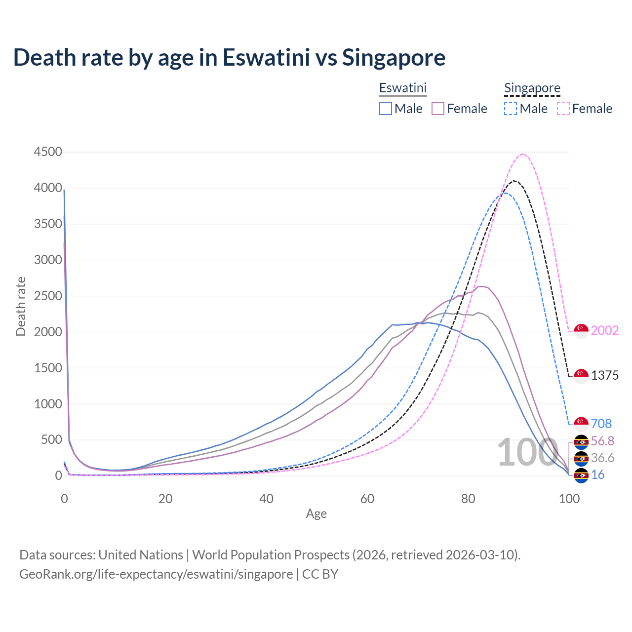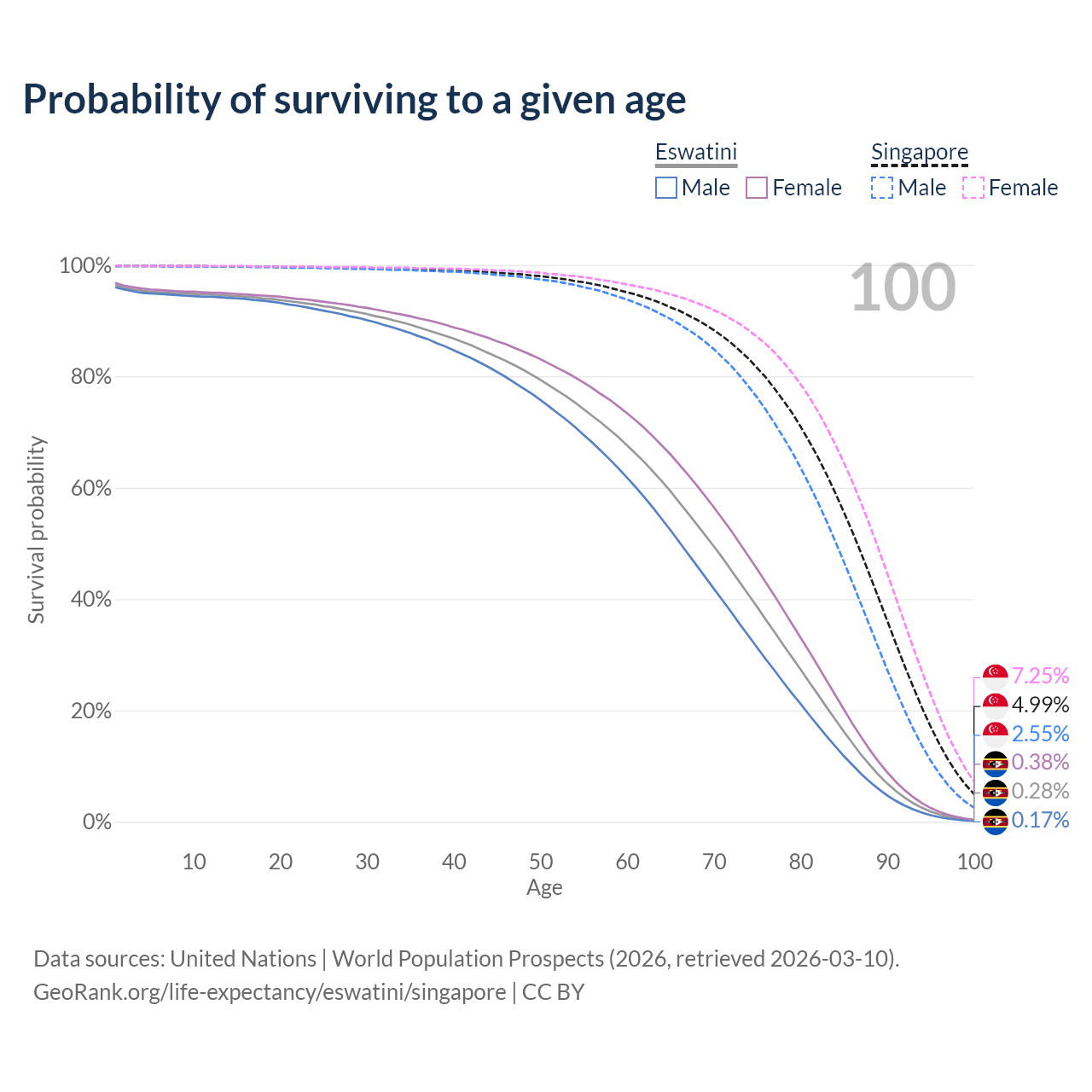 This life expectancy calculator shows the odds of living to 100, 95, 90, and below based on current age for both males and females in Eswatini and Singapore, along with mean and median age of death. The calculations are based on the 2026 life tables (actuarial tables) from the UN World Population Prospects.