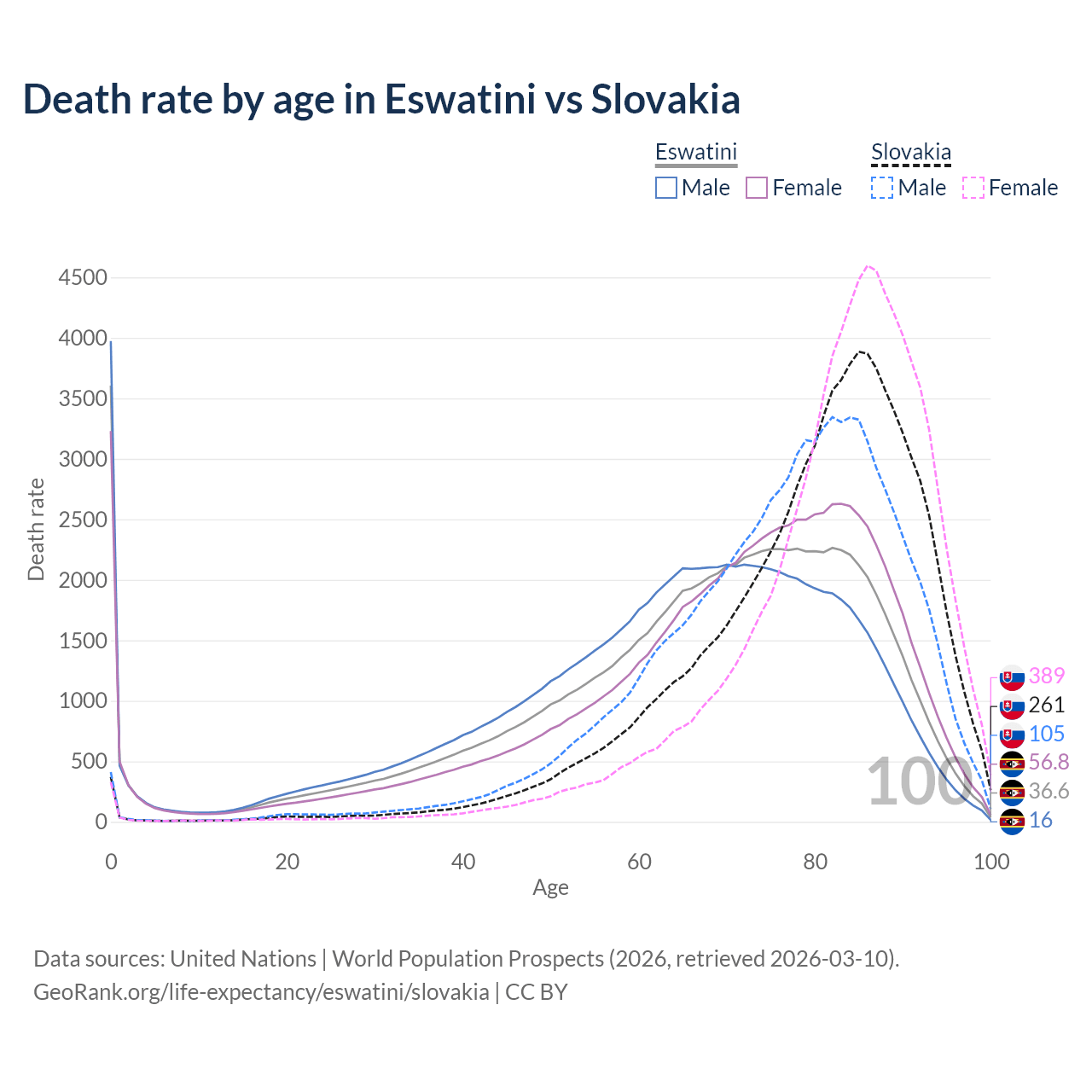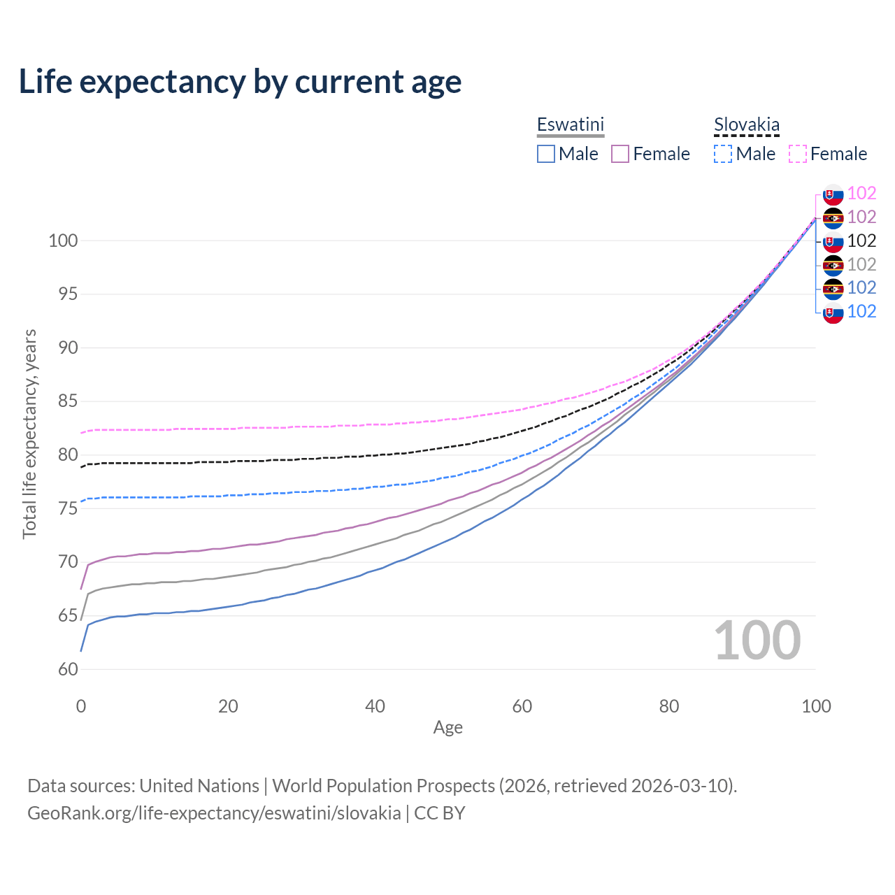 This life expectancy calculator shows the odds of living to 100, 95, 90, and below based on current age for both males and females in Eswatini and Slovakia, along with mean and median age of death. The calculations are based on the 2026 life tables (actuarial tables) from the UN World Population Prospects.