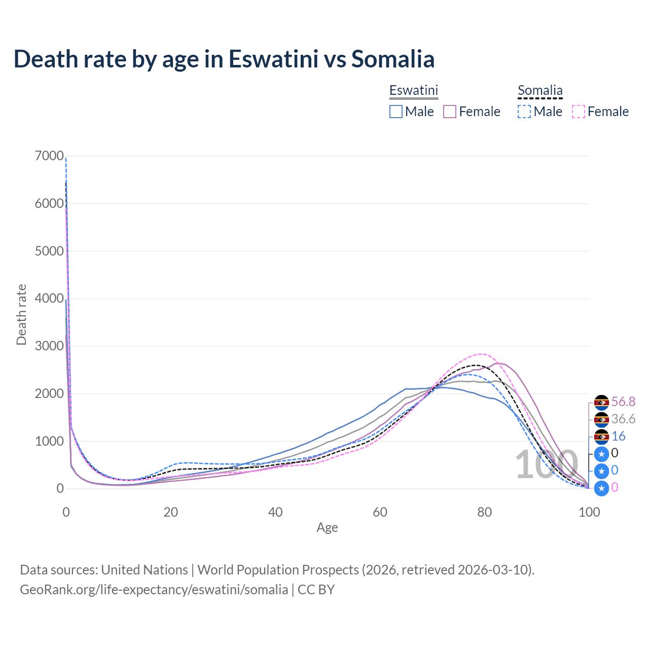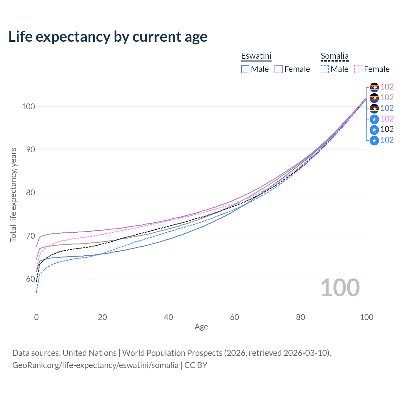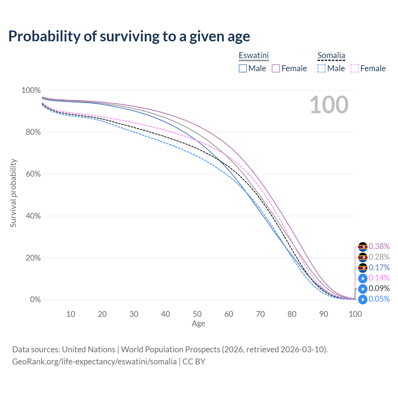 This life expectancy calculator shows the odds of living to 100, 95, 90, and below based on current age for both males and females in Eswatini and Somalia, along with mean and median age of death. The calculations are based on the 2026 life tables (actuarial tables) from the UN World Population Prospects.