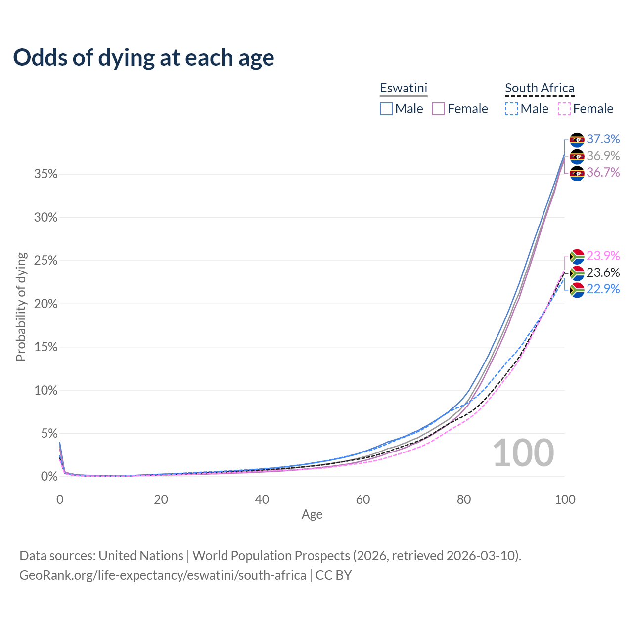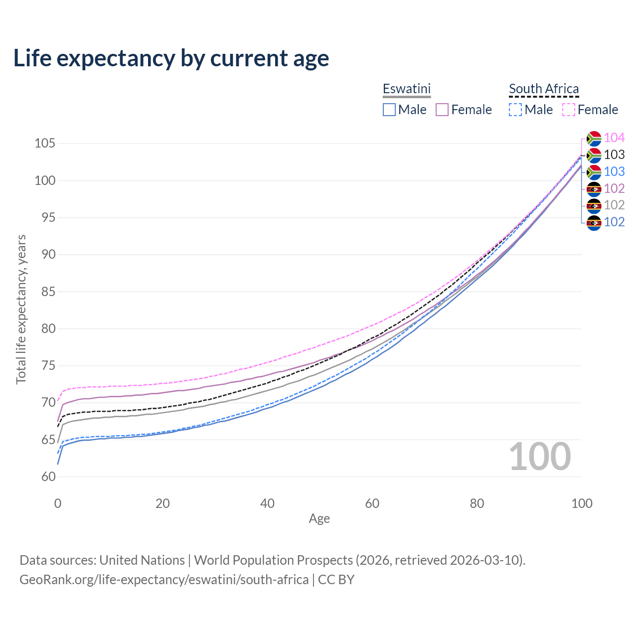 This life expectancy calculator shows the odds of living to 100, 95, 90, and below based on current age for both males and females in Eswatini and South Africa, along with mean and median age of death. The calculations are based on the 2026 life tables (actuarial tables) from the UN World Population Prospects.