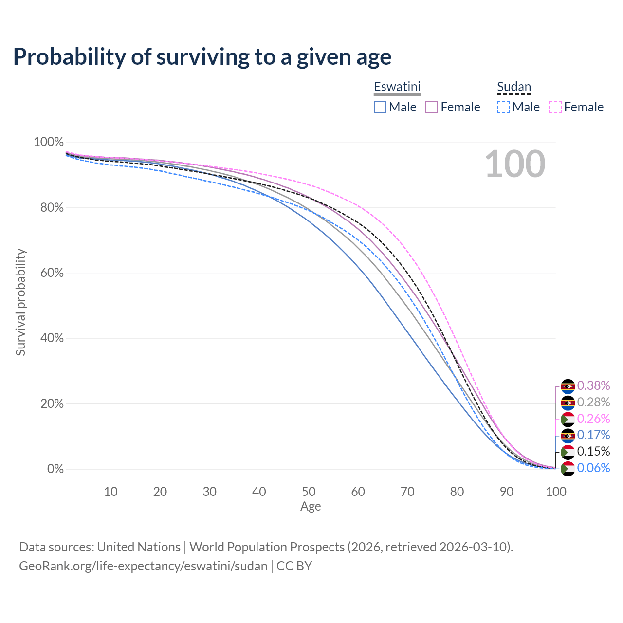 This life expectancy calculator shows the odds of living to 100, 95, 90, and below based on current age for both males and females in Eswatini and Sudan, along with mean and median age of death. The calculations are based on the 2026 life tables (actuarial tables) from the UN World Population Prospects.