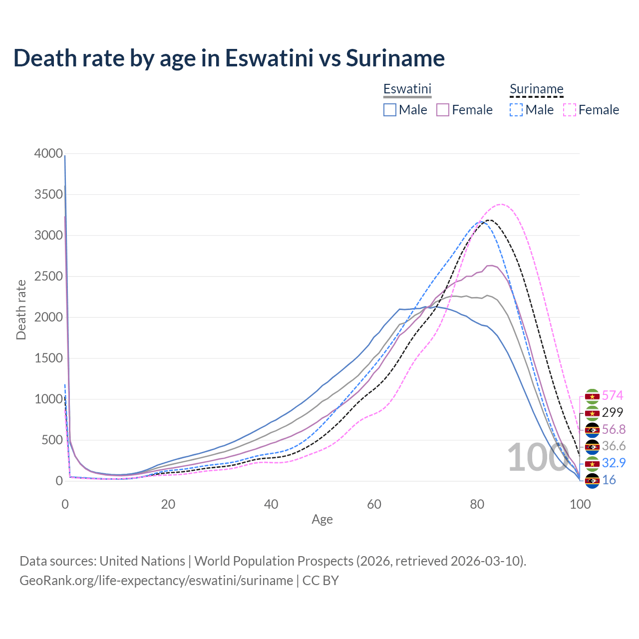 This life expectancy calculator shows the odds of living to 100, 95, 90, and below based on current age for both males and females in Eswatini and Suriname, along with mean and median age of death. The calculations are based on the 2026 life tables (actuarial tables) from the UN World Population Prospects.