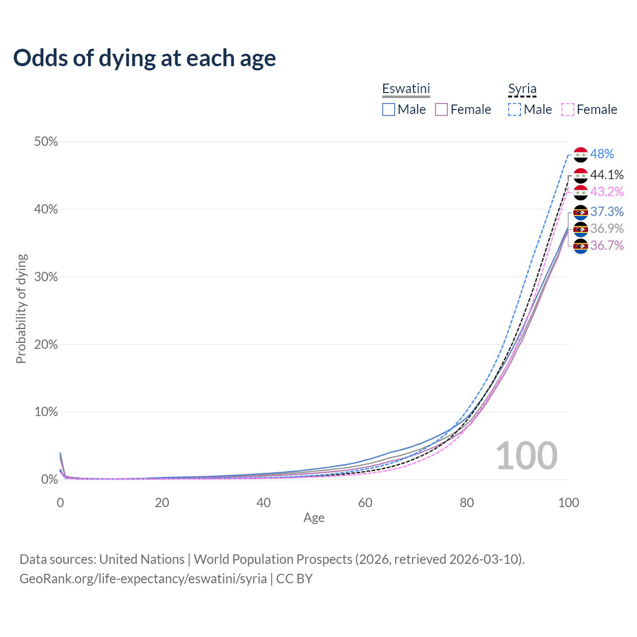 This life expectancy calculator shows the odds of living to 100, 95, 90, and below based on current age for both males and females in Eswatini and Syria, along with mean and median age of death. The calculations are based on the 2026 life tables (actuarial tables) from the UN World Population Prospects.