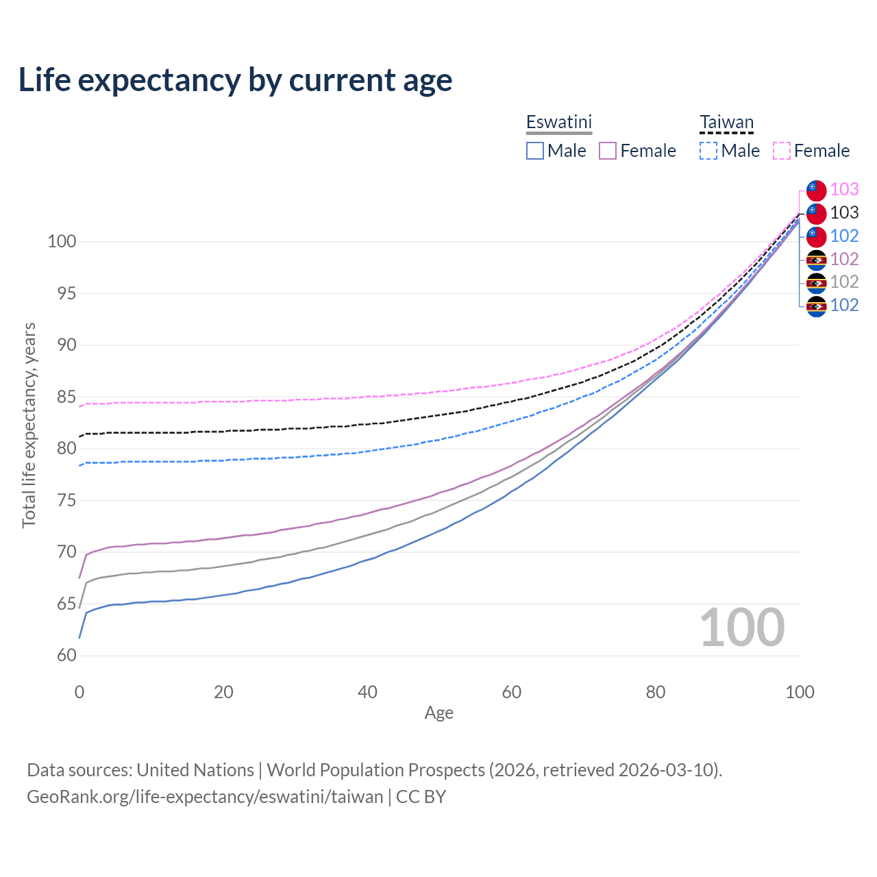 This life expectancy calculator shows the odds of living to 100, 95, 90, and below based on current age for both males and females in Eswatini and Taiwan, along with mean and median age of death. The calculations are based on the 2026 life tables (actuarial tables) from the UN World Population Prospects.