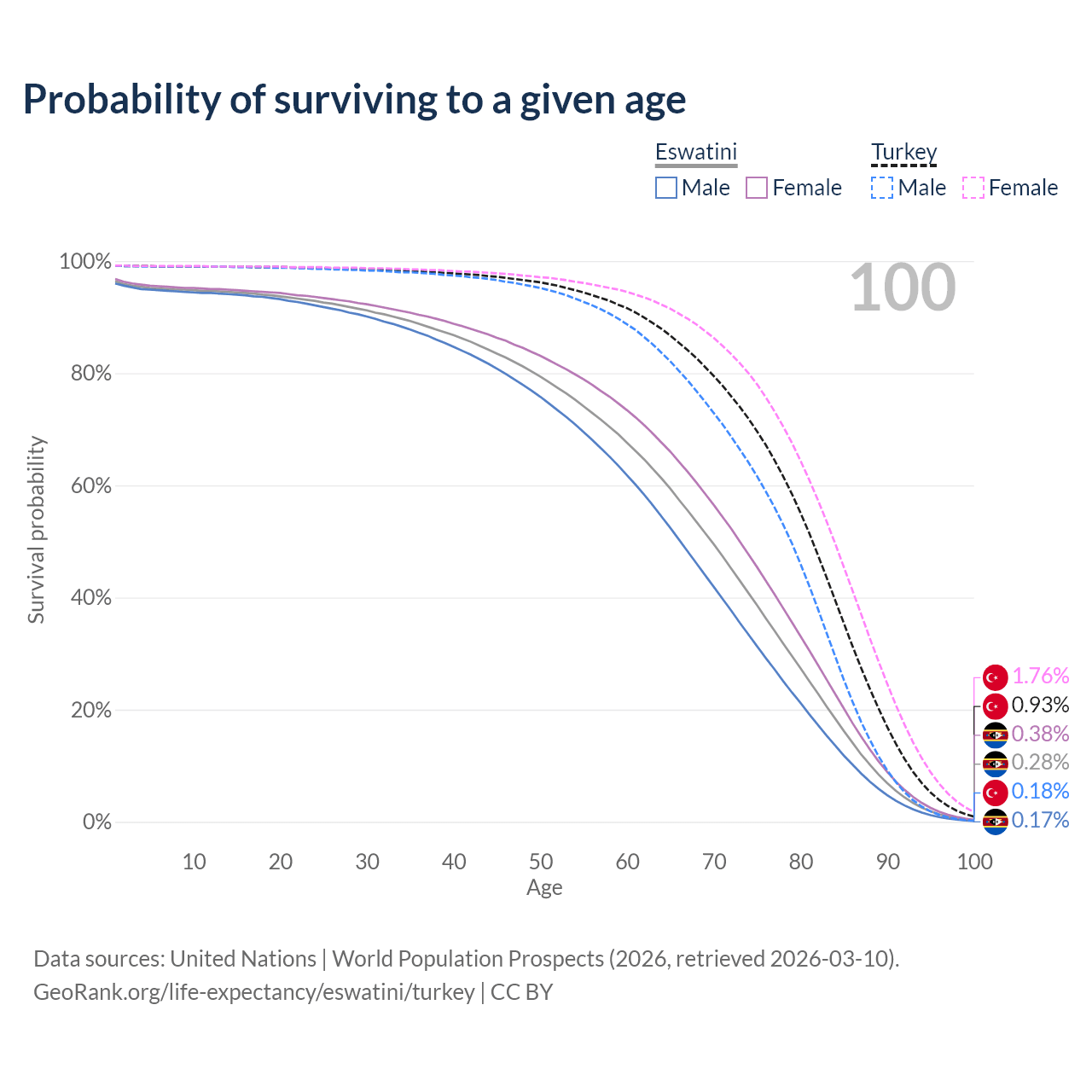 This life expectancy calculator shows the odds of living to 100, 95, 90, and below based on current age for both males and females in Eswatini and Turkey, along with mean and median age of death. The calculations are based on the 2026 life tables (actuarial tables) from the UN World Population Prospects.