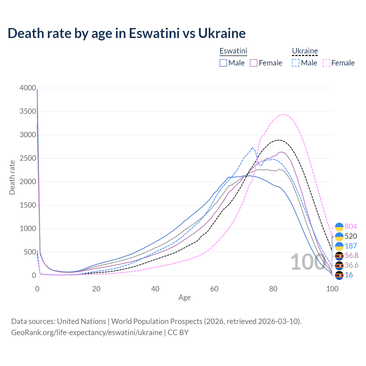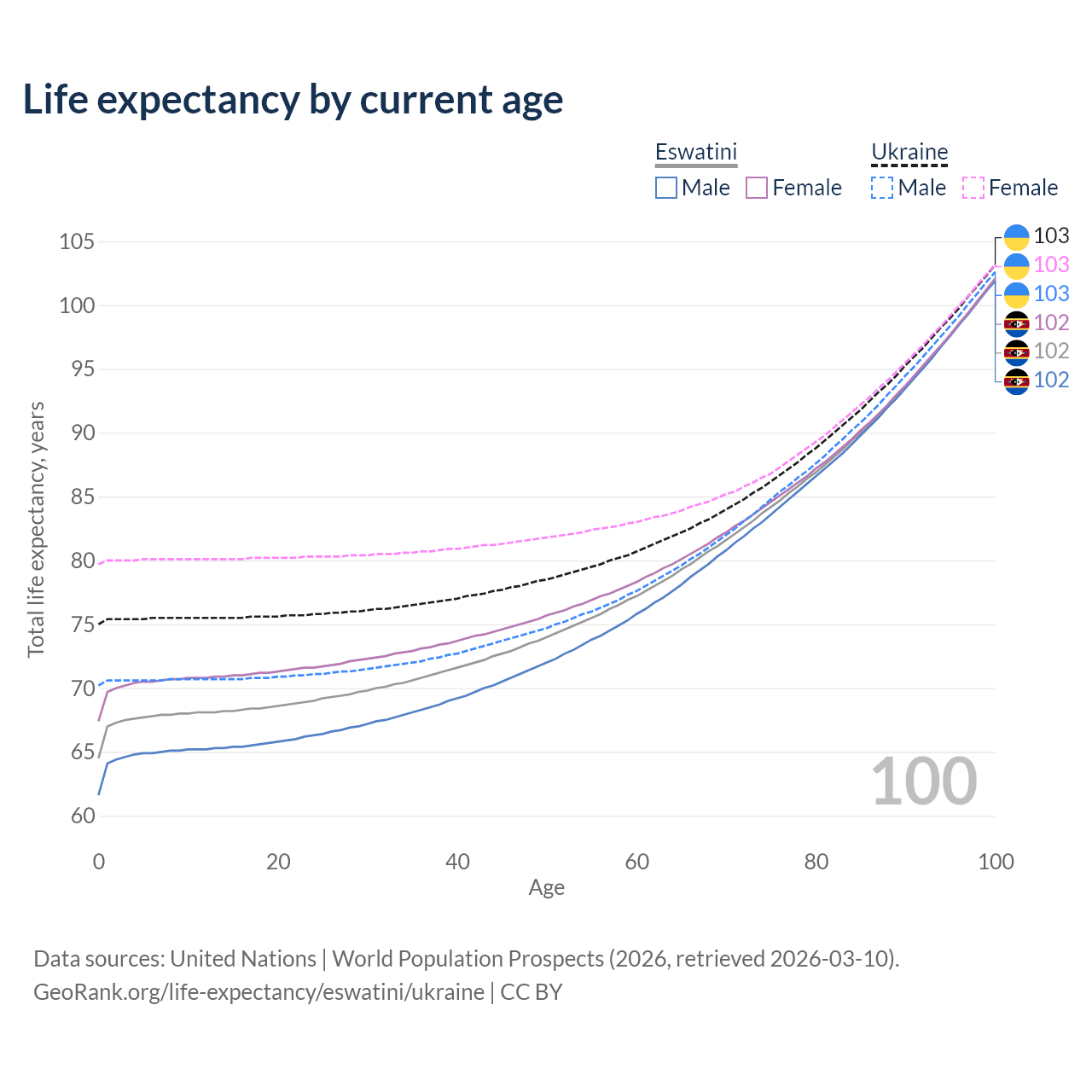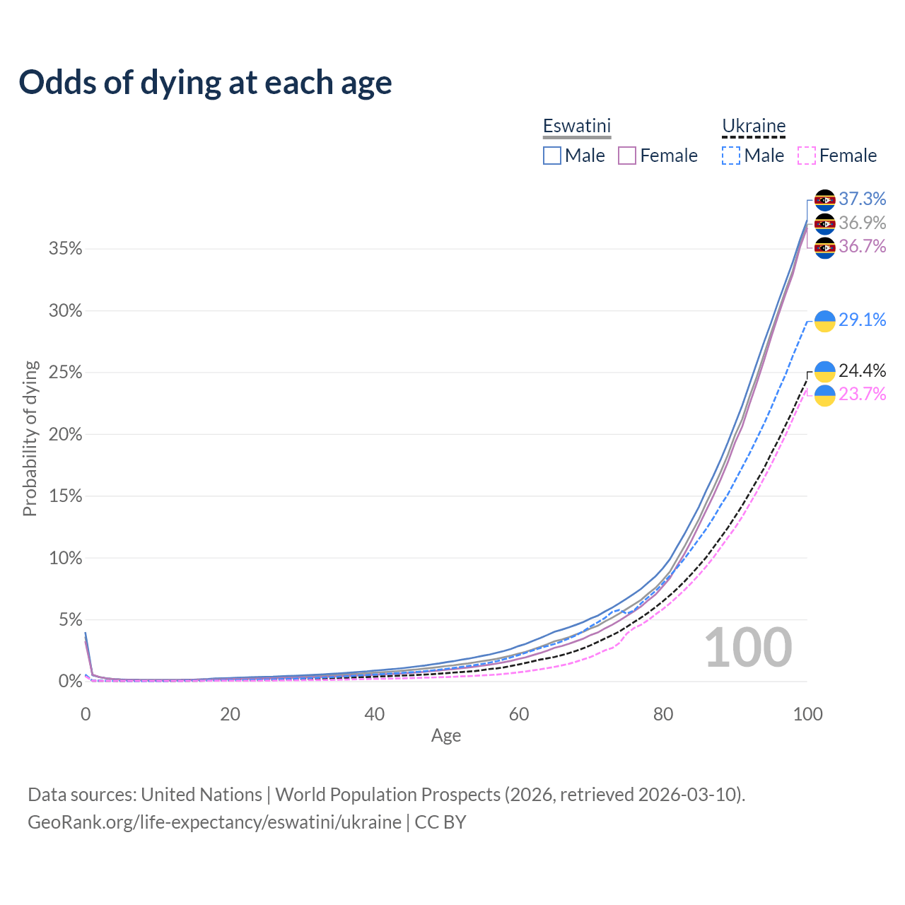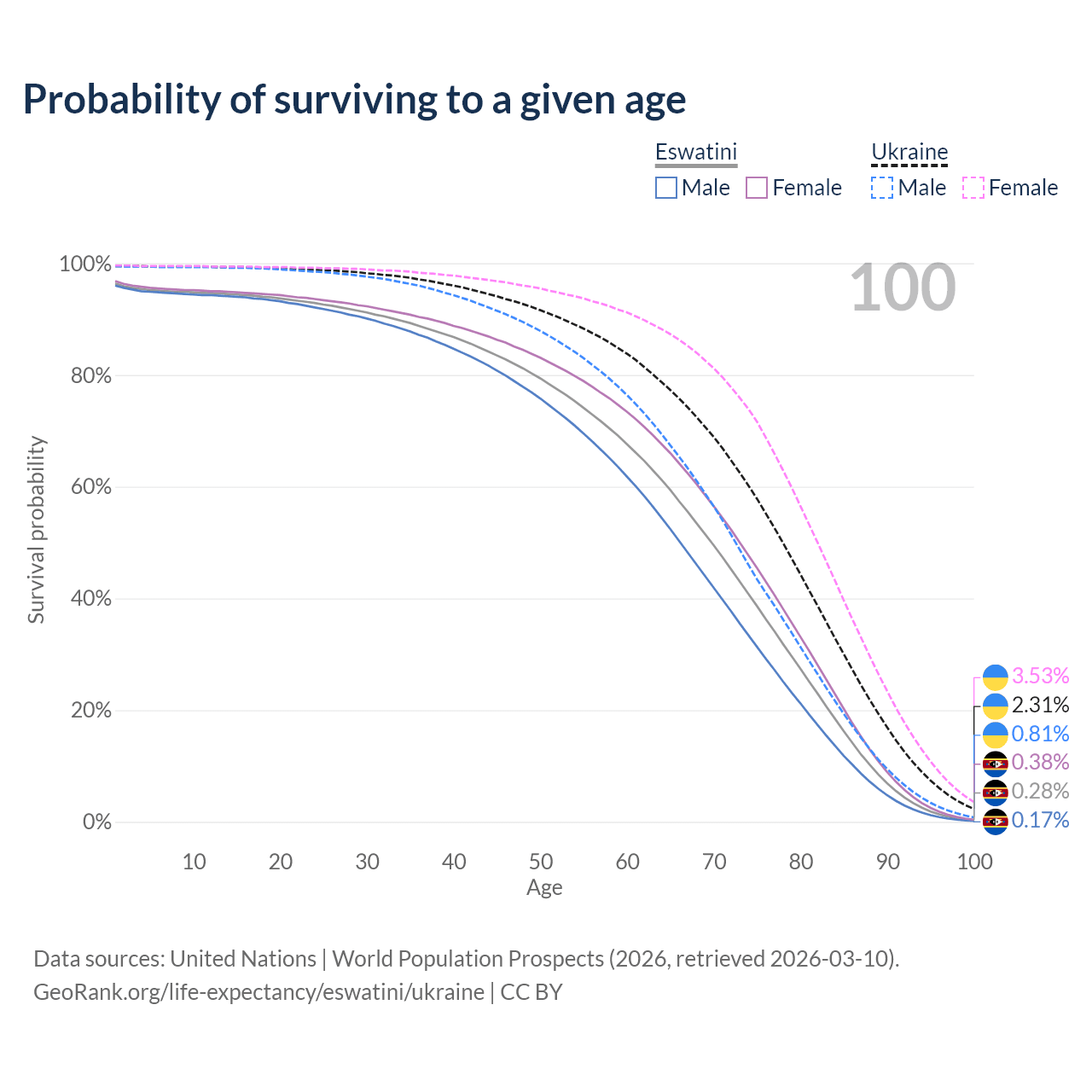 This life expectancy calculator shows the odds of living to 100, 95, 90, and below based on current age for both males and females in Eswatini and Ukraine, along with mean and median age of death. The calculations are based on the 2026 life tables (actuarial tables) from the UN World Population Prospects.