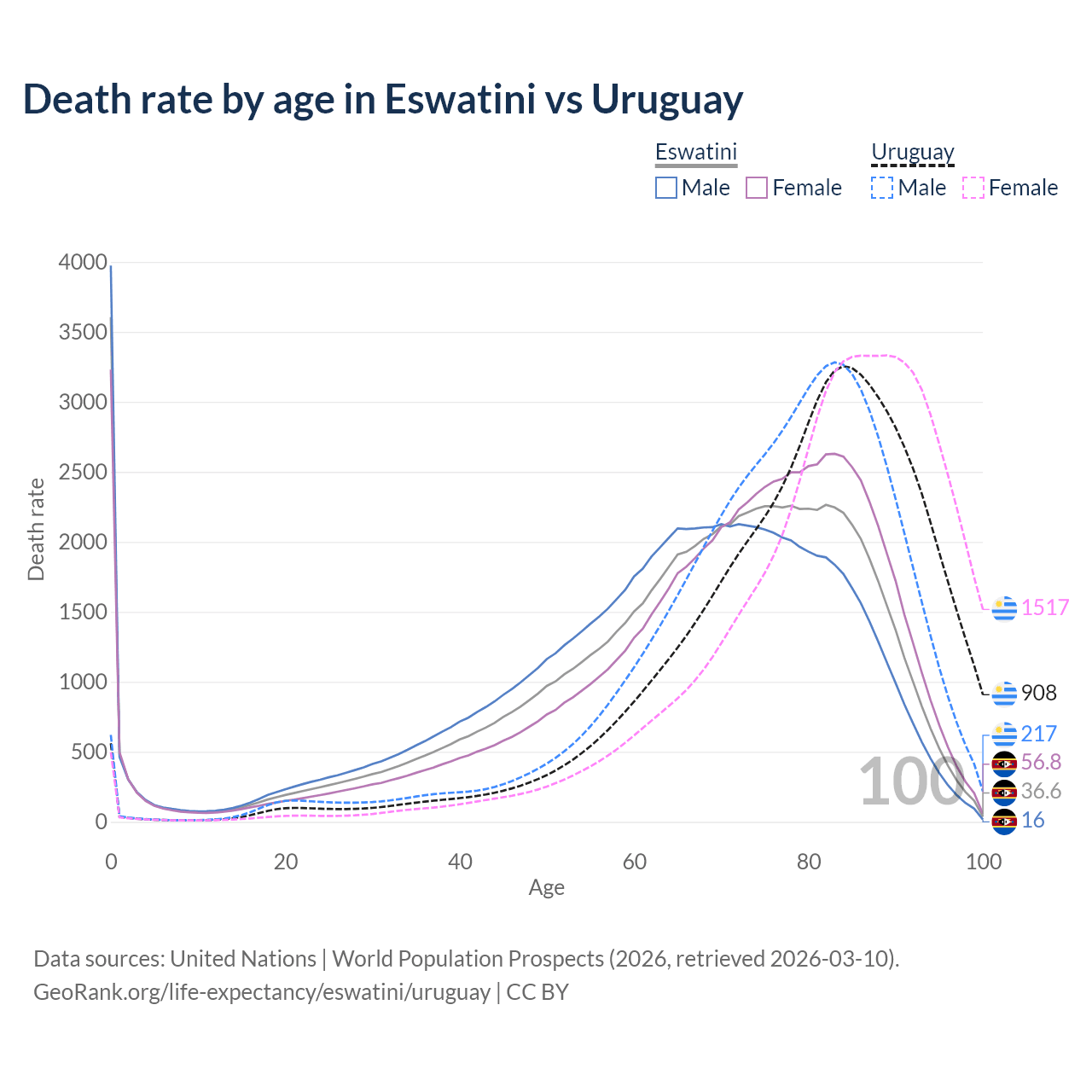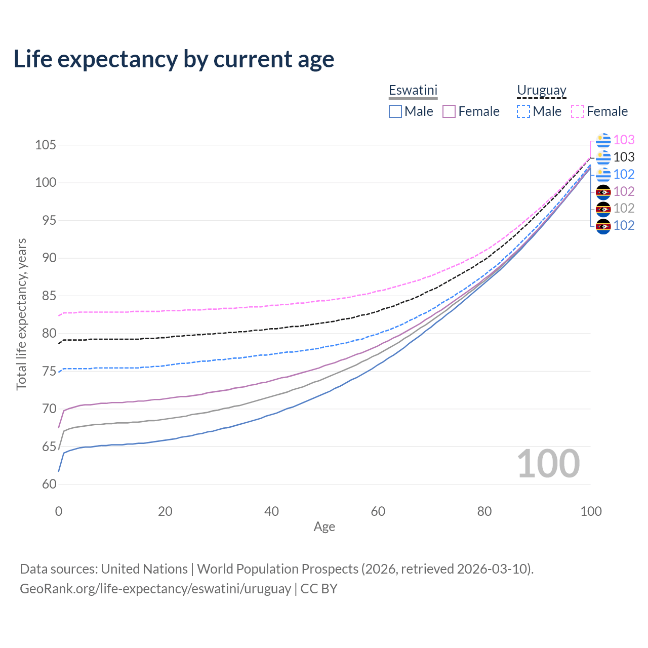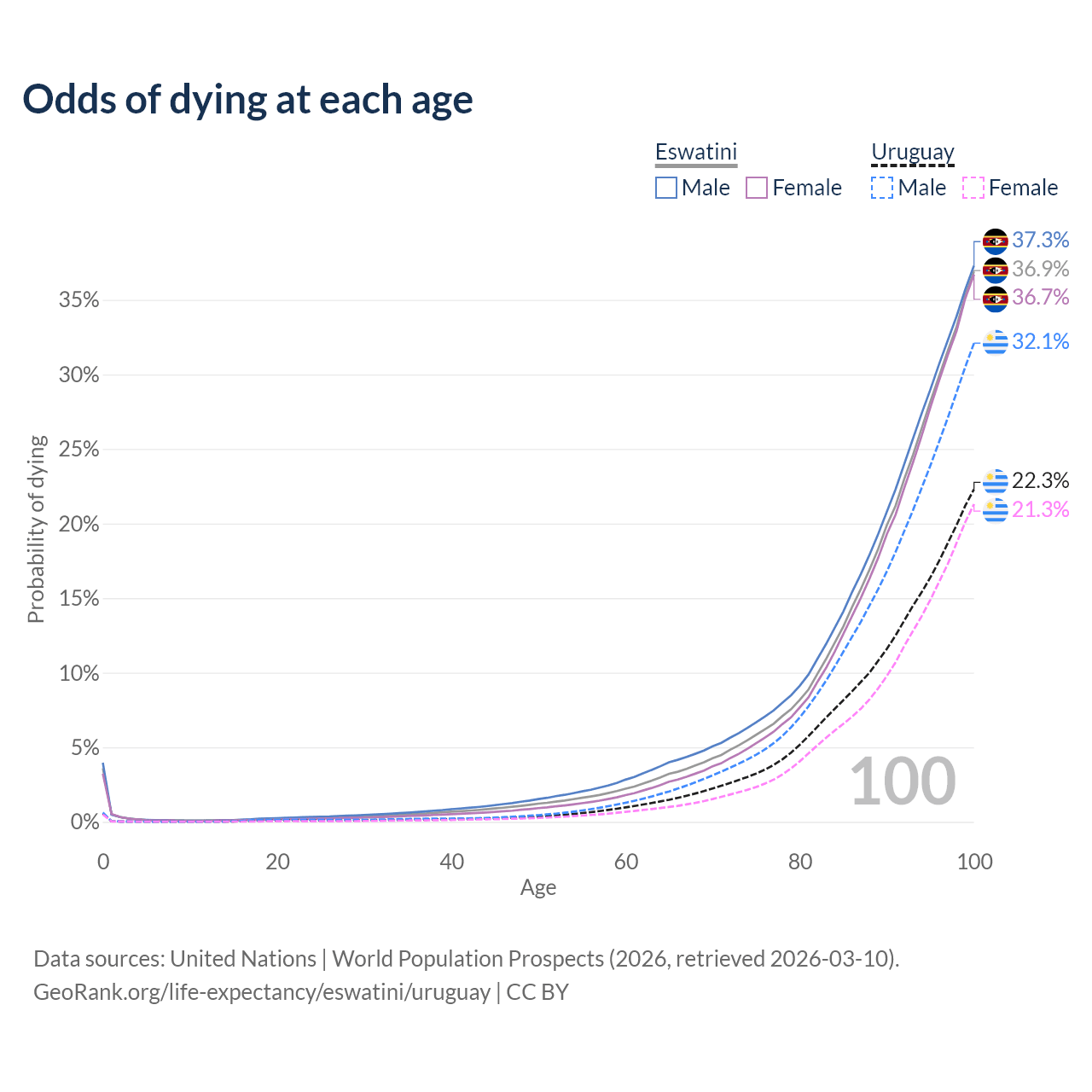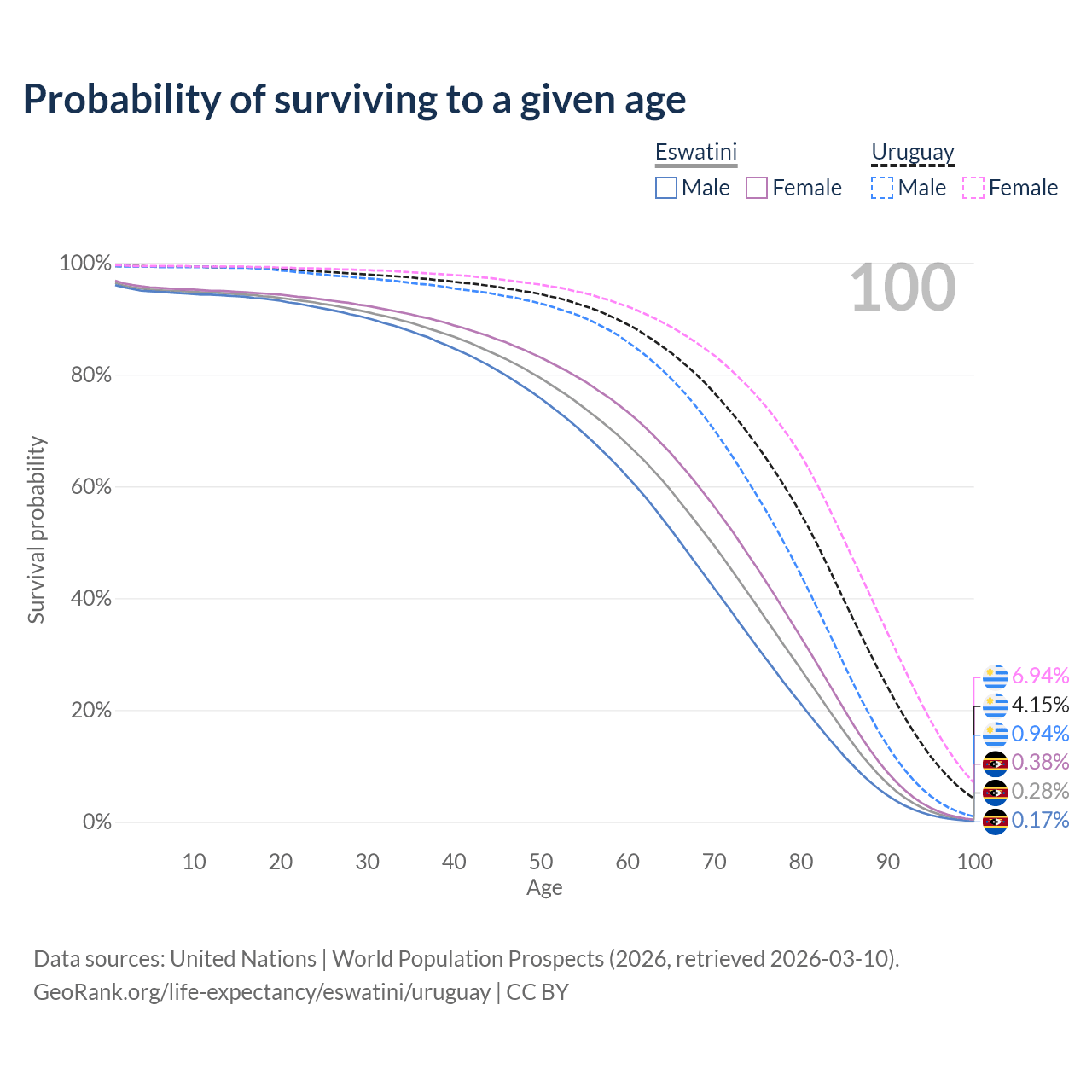 This life expectancy calculator shows the odds of living to 100, 95, 90, and below based on current age for both males and females in Eswatini and Uruguay, along with mean and median age of death. The calculations are based on the 2026 life tables (actuarial tables) from the UN World Population Prospects.