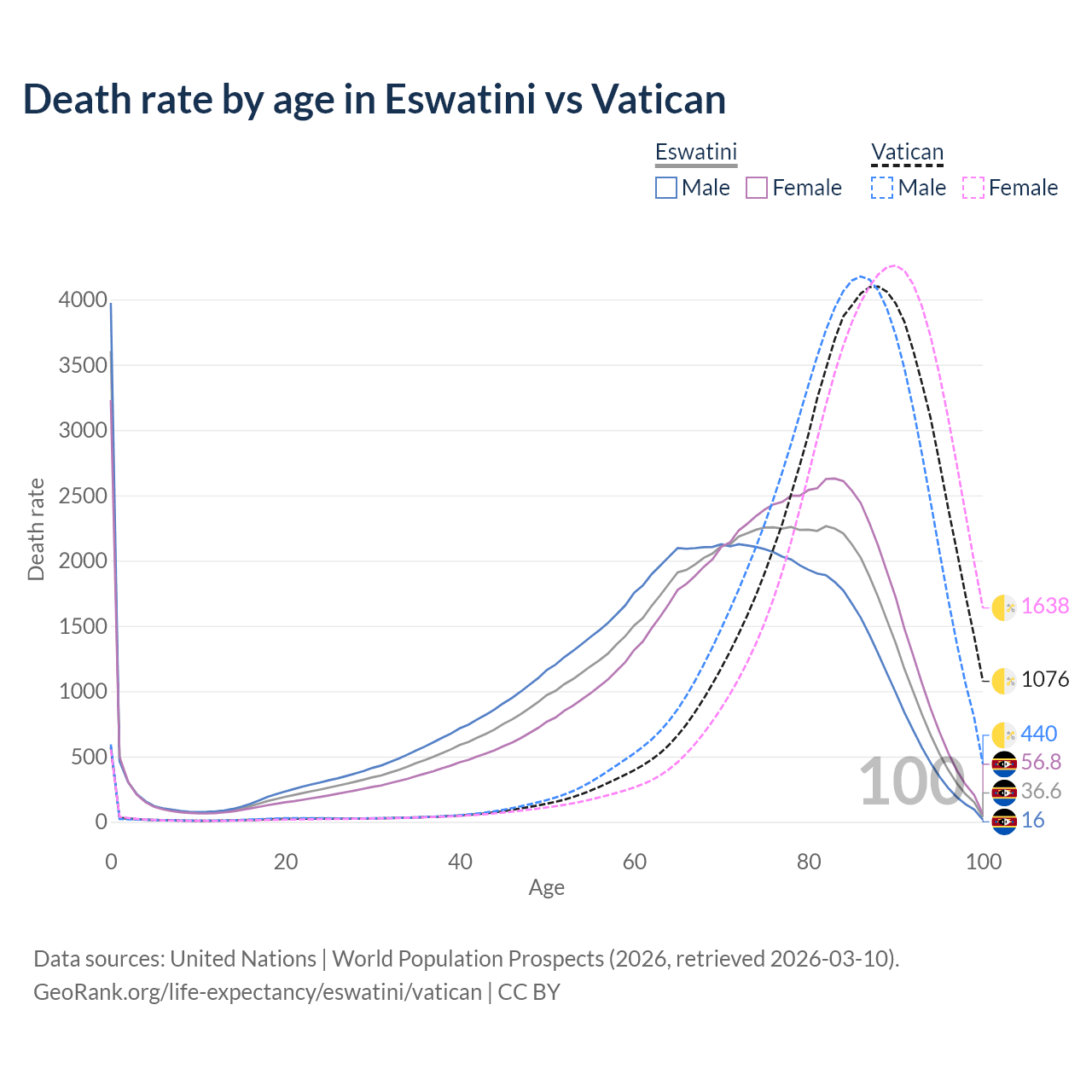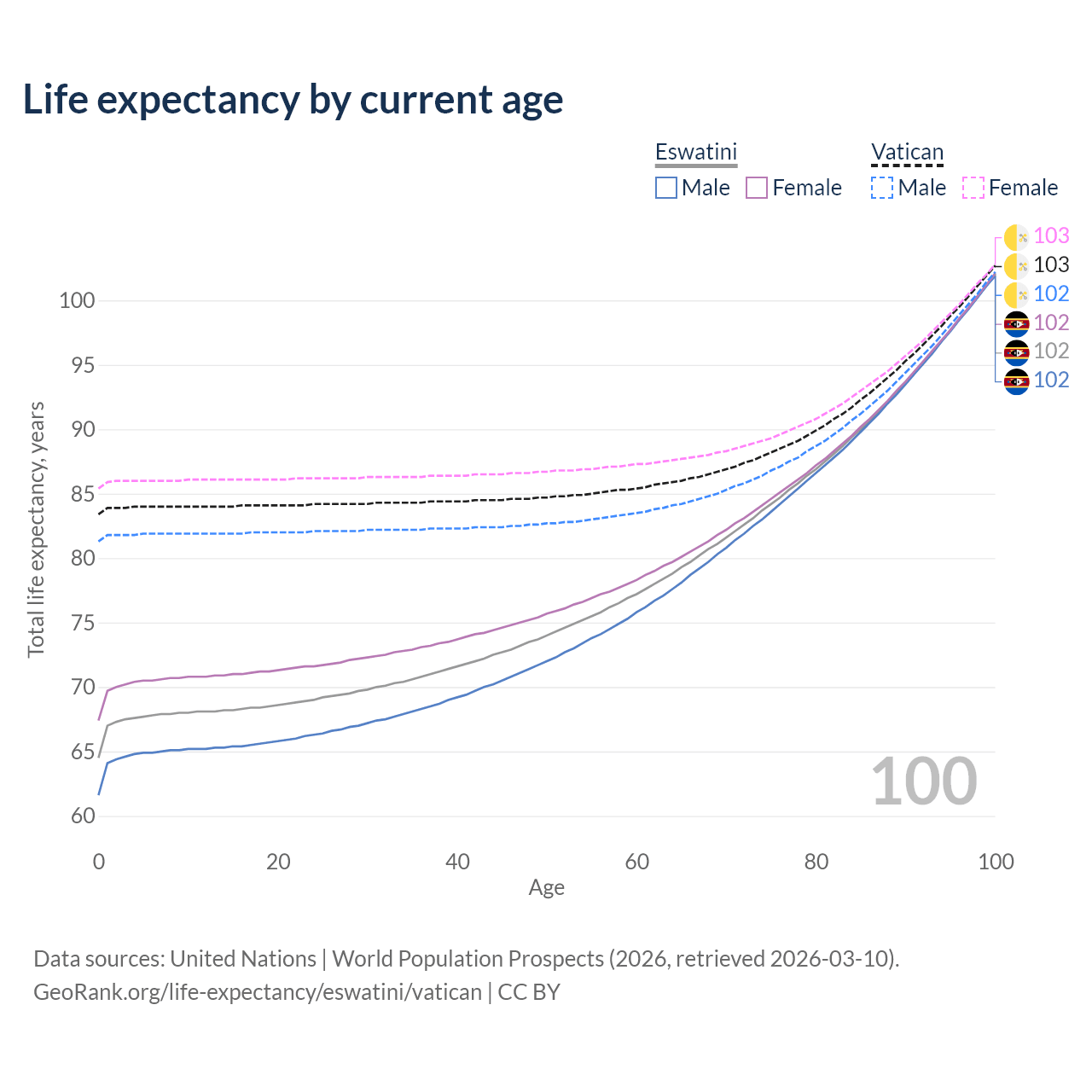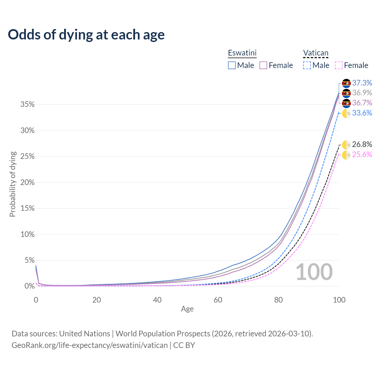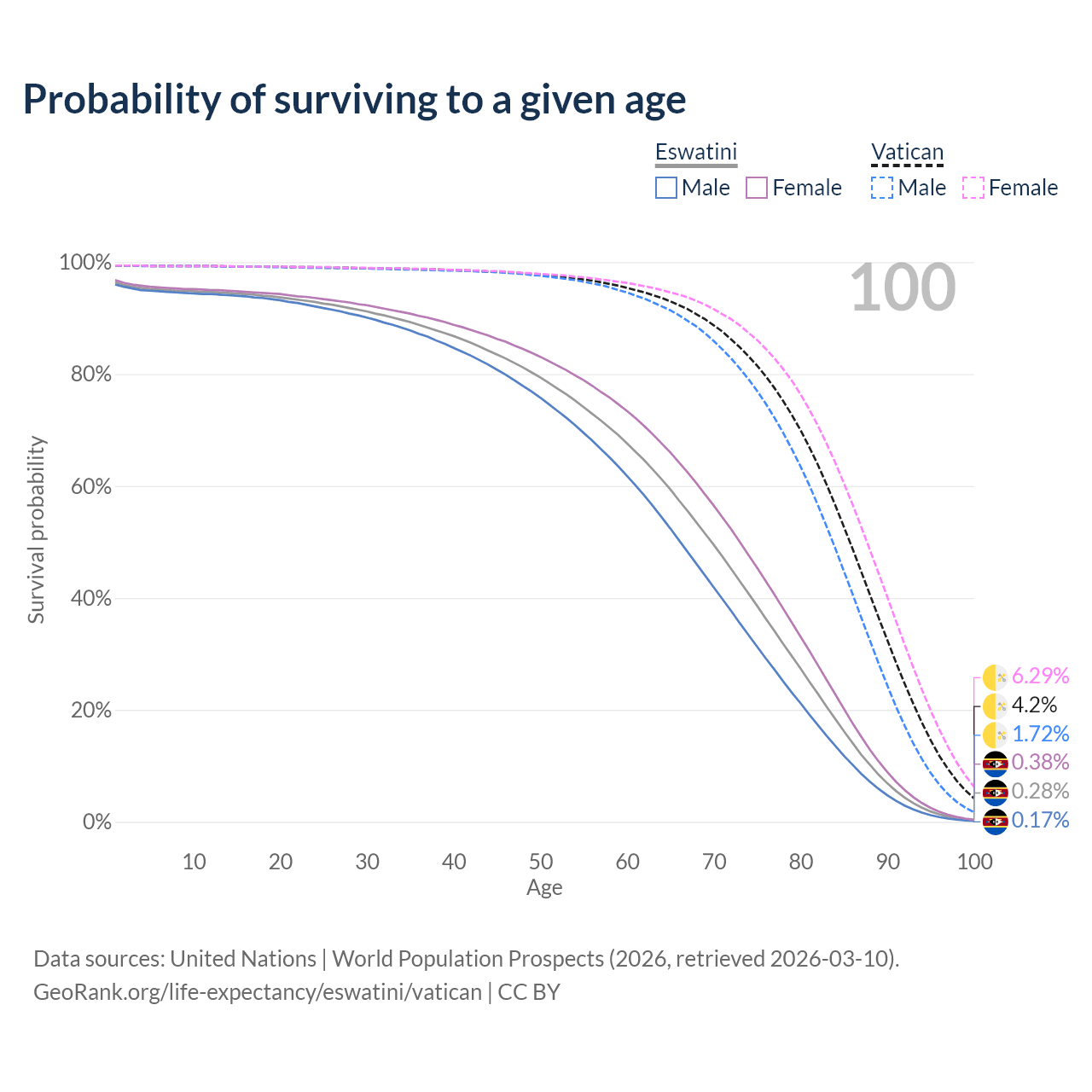 This life expectancy calculator shows the odds of living to 100, 95, 90, and below based on current age for both males and females in Eswatini and the Vatican, along with mean and median age of death. The calculations are based on the 2026 life tables (actuarial tables) from the UN World Population Prospects.