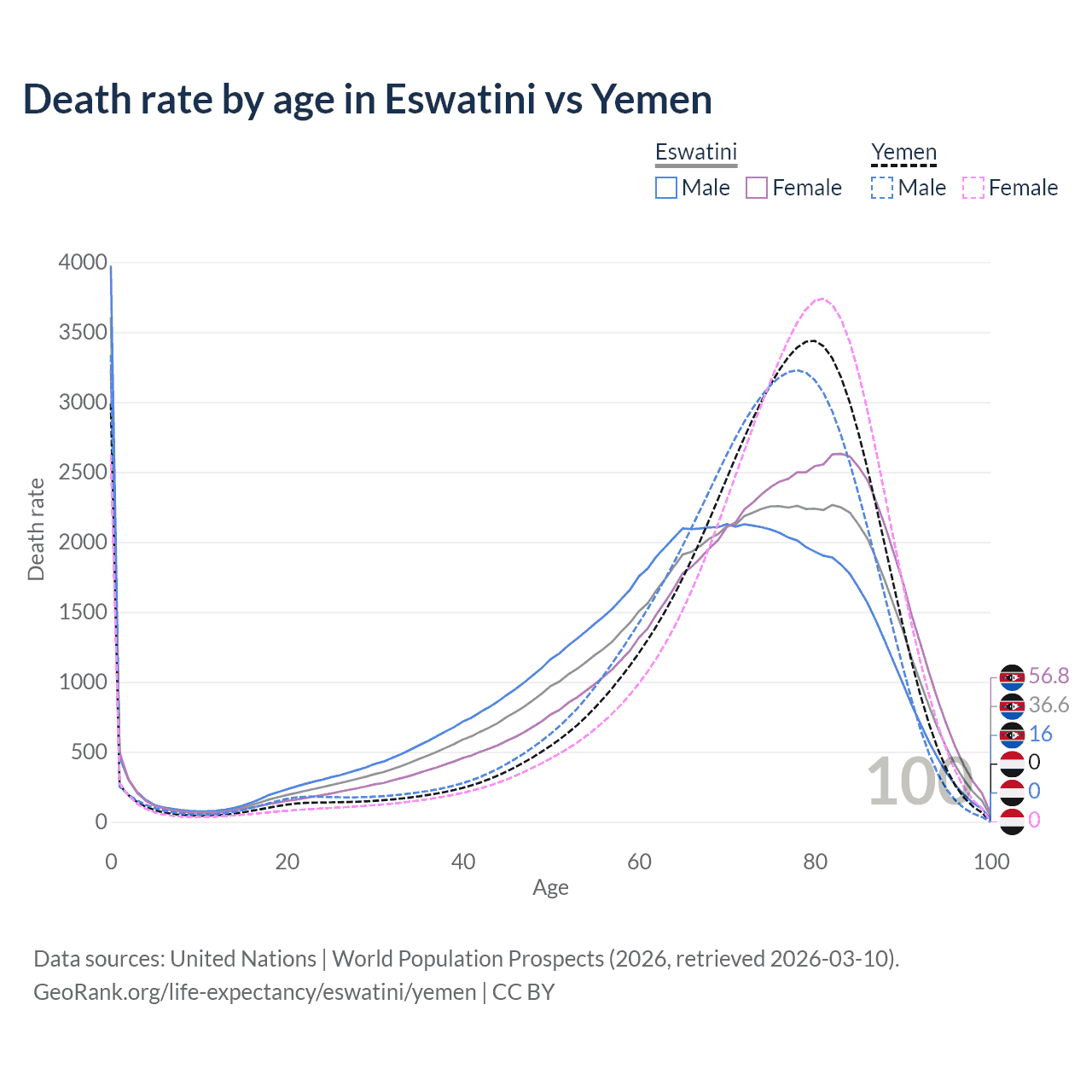 This life expectancy calculator shows the odds of living to 100, 95, 90, and below based on current age for both males and females in Eswatini and Yemen, along with mean and median age of death. The calculations are based on the 2026 life tables (actuarial tables) from the UN World Population Prospects.