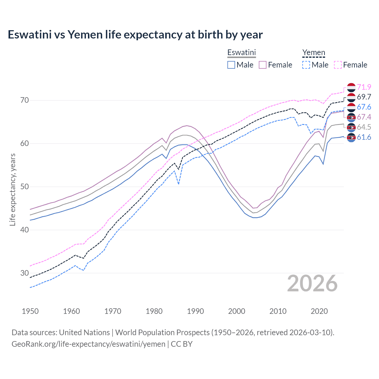 The average life expectancy at birth is 64.5 years in Eswatini vs 69.7 in Yemen. Eswatini is ranked 173/197 by life expectancy, and Yemen is 138/197. In Eswatini, the life expectancy is 61.6 years for males and 67.4 years for females. In Yemen, it's 67.6 years for males and 71.9 years for females.