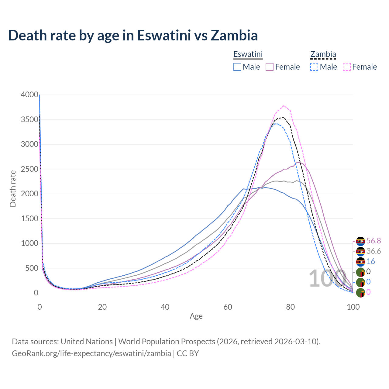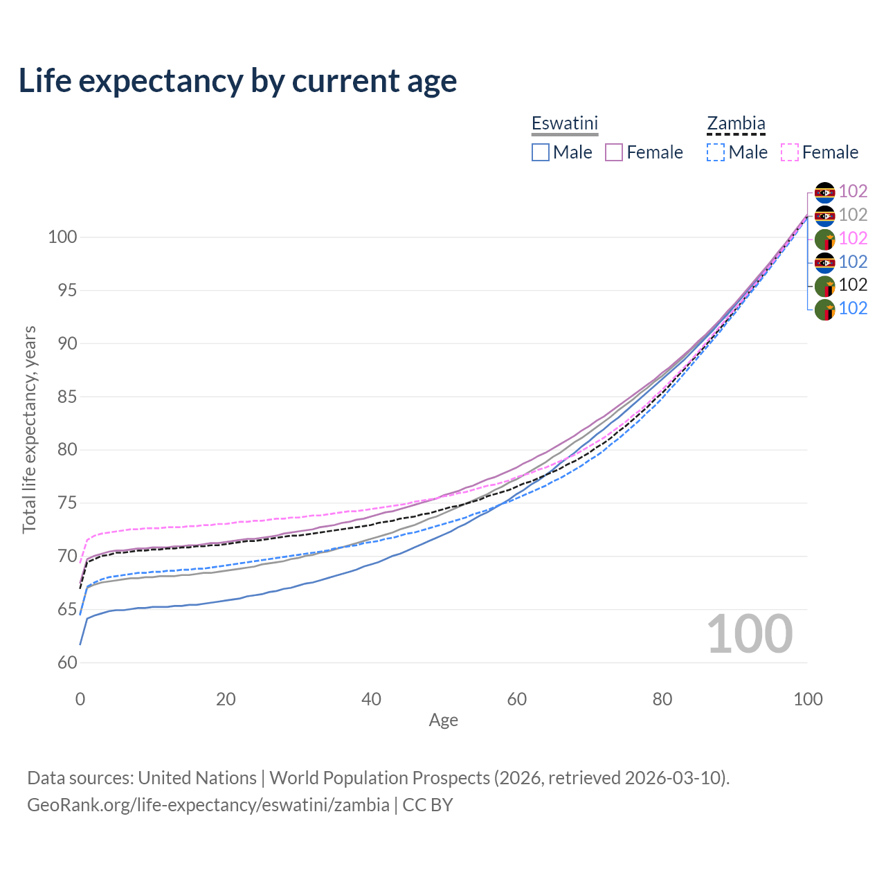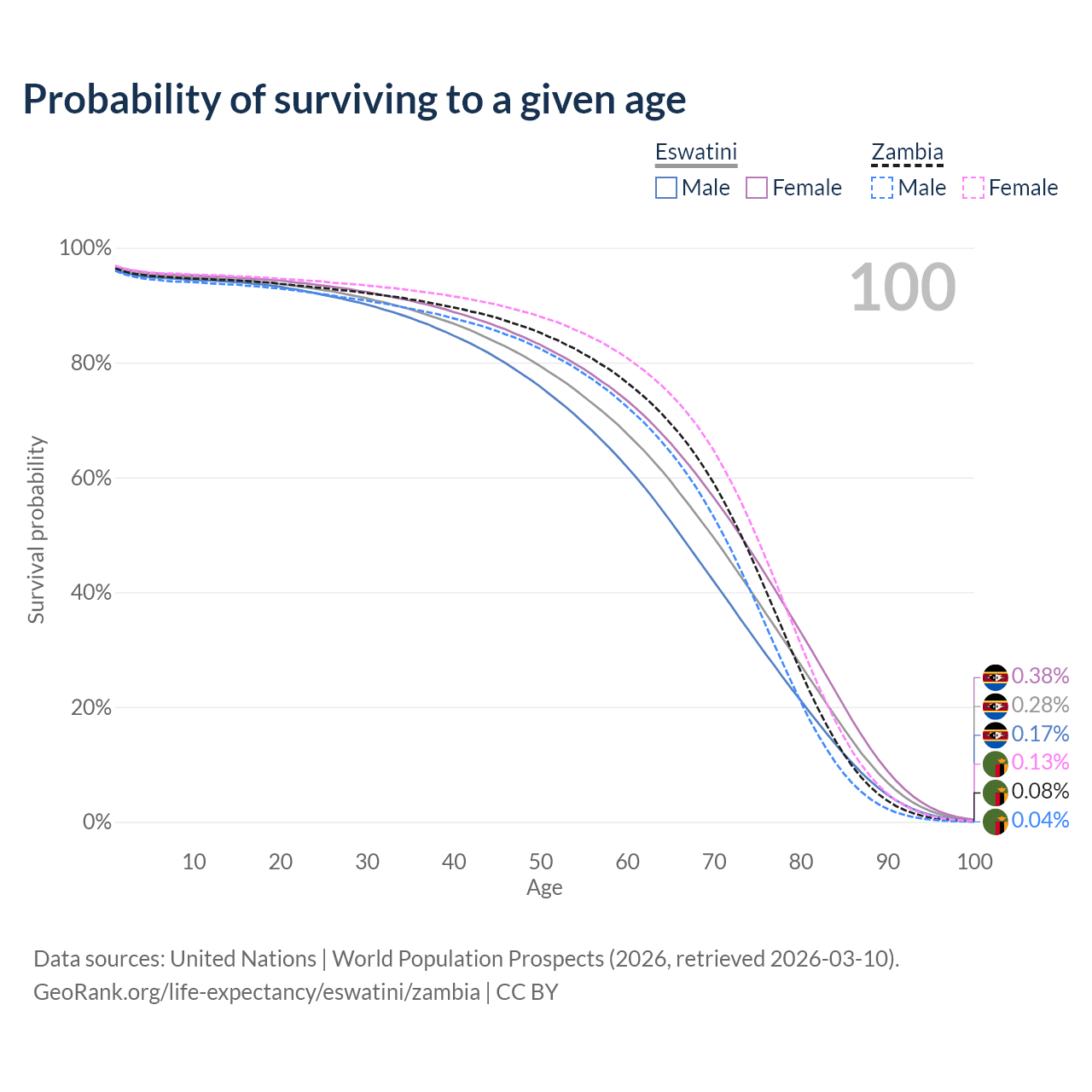 This life expectancy calculator shows the odds of living to 100, 95, 90, and below based on current age for both males and females in Eswatini and Zambia, along with mean and median age of death. The calculations are based on the 2026 life tables (actuarial tables) from the UN World Population Prospects.