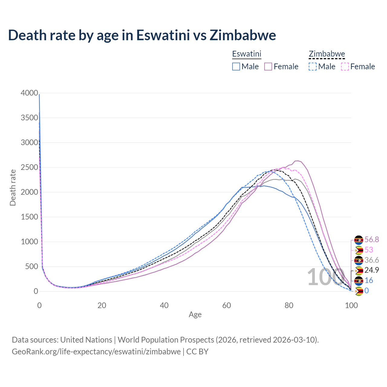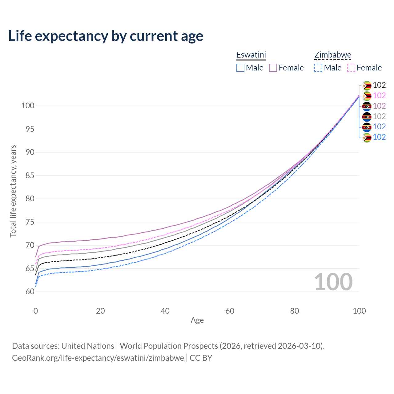 This life expectancy calculator shows the odds of living to 100, 95, 90, and below based on current age for both males and females in Eswatini and Zimbabwe, along with mean and median age of death. The calculations are based on the 2026 life tables (actuarial tables) from the UN World Population Prospects.