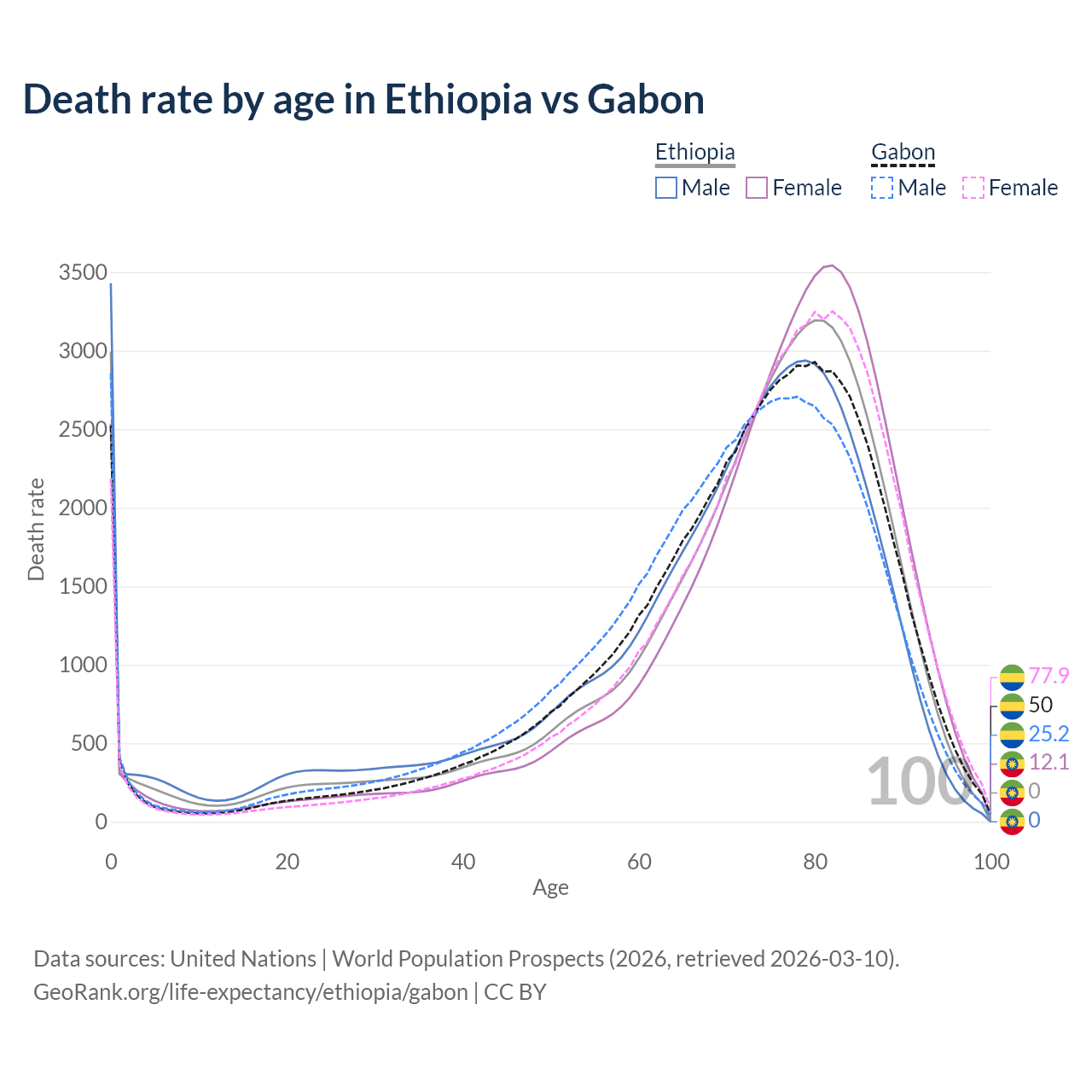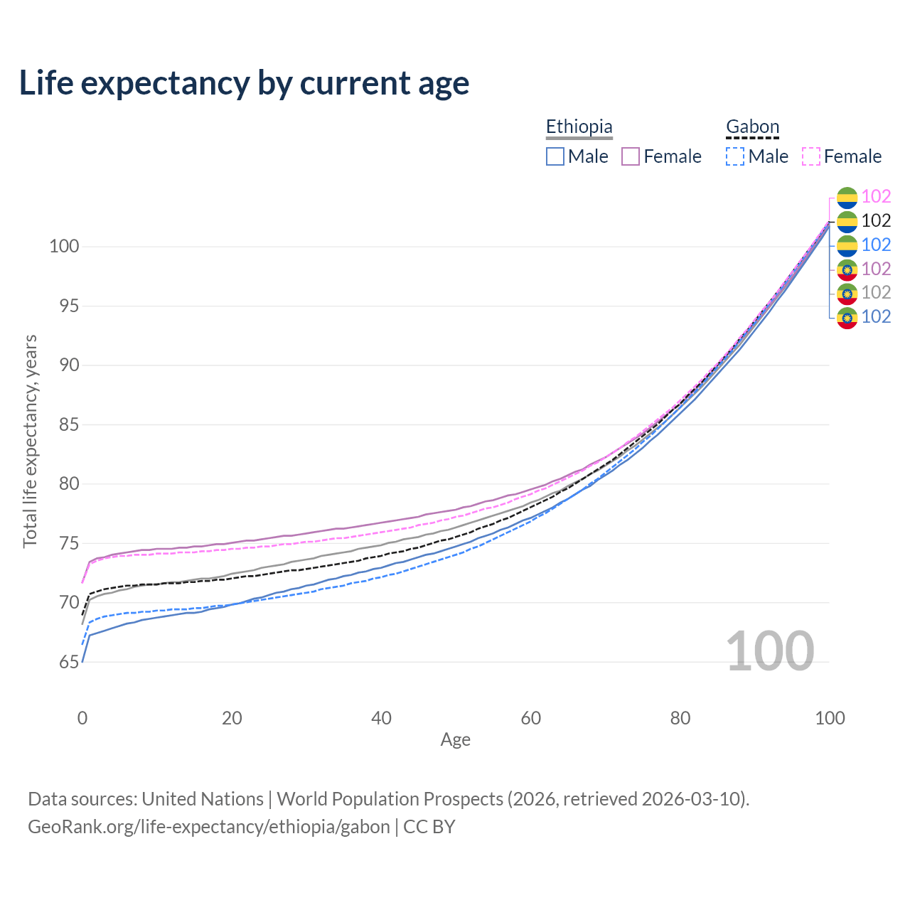 This life expectancy calculator shows the odds of living to 100, 95, 90, and below based on current age for both males and females in Ethiopia and Gabon, along with mean and median age of death. The calculations are based on the 2026 life tables (actuarial tables) from the UN World Population Prospects.