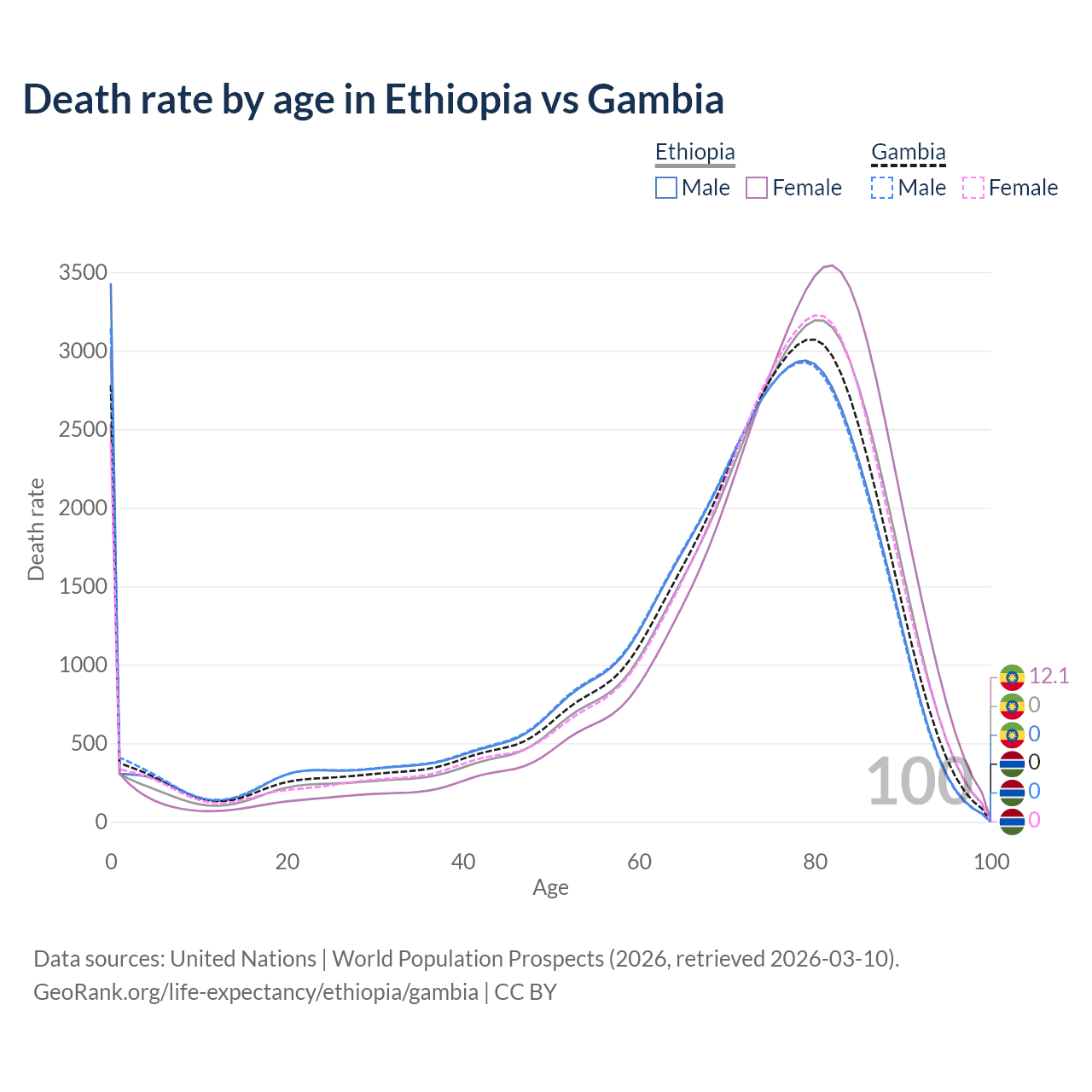 This life expectancy calculator shows the odds of living to 100, 95, 90, and below based on current age for both males and females in Ethiopia and the Gambia, along with mean and median age of death. The calculations are based on the 2026 life tables (actuarial tables) from the UN World Population Prospects.