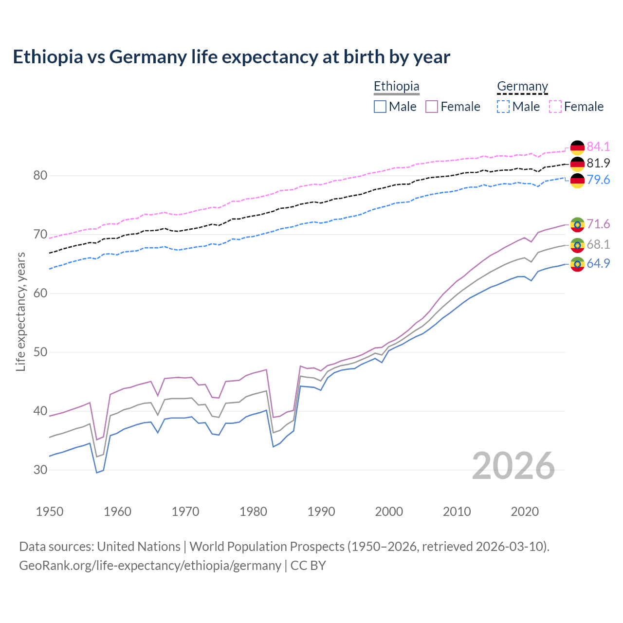 The average life expectancy at birth is 68.1 years in Ethiopia vs 81.9 in Germany. Ethiopia is ranked 150/197 by life expectancy, and Germany is 34/197. In Ethiopia, the life expectancy is 64.9 years for males and 71.6 years for females. In Germany, it's 79.6 years for males and 84.1 years for females.