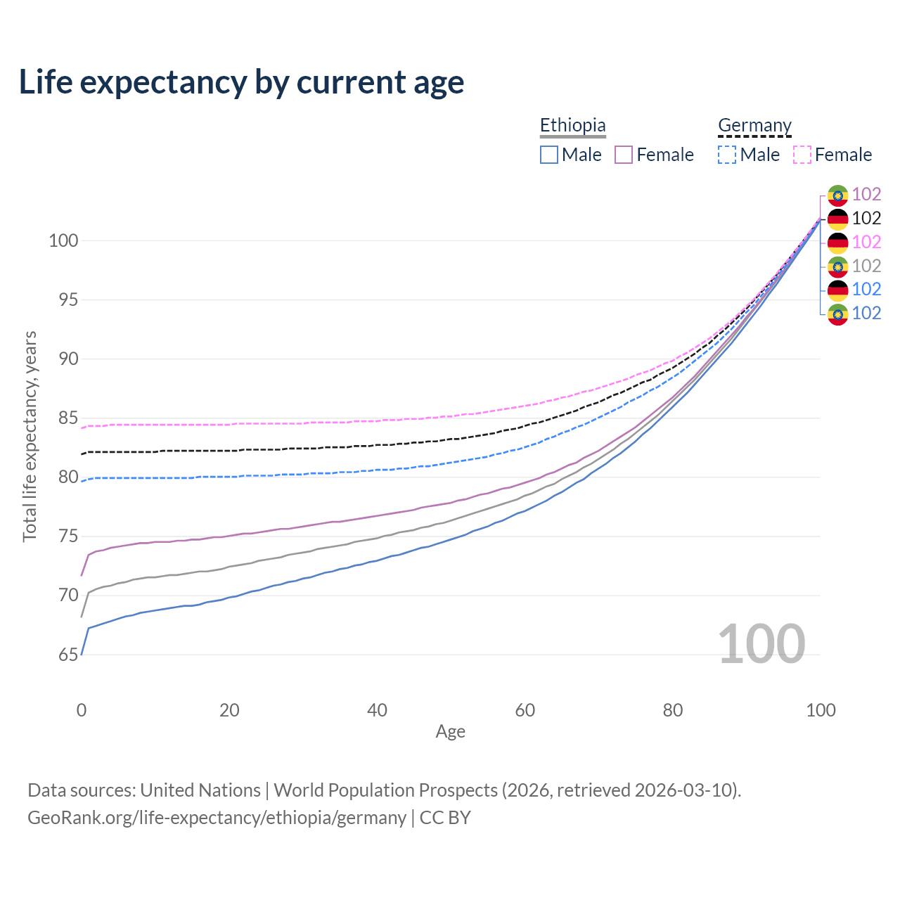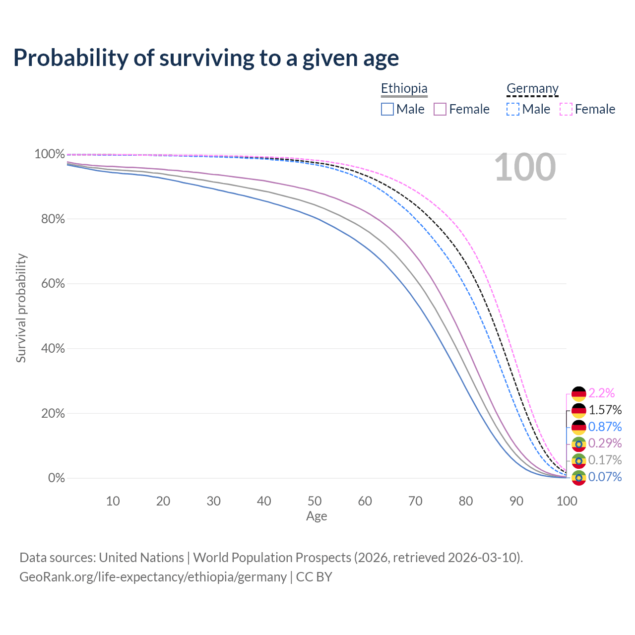 This life expectancy calculator shows the odds of living to 100, 95, 90, and below based on current age for both males and females in Ethiopia and Germany, along with mean and median age of death. The calculations are based on the 2026 life tables (actuarial tables) from the UN World Population Prospects.