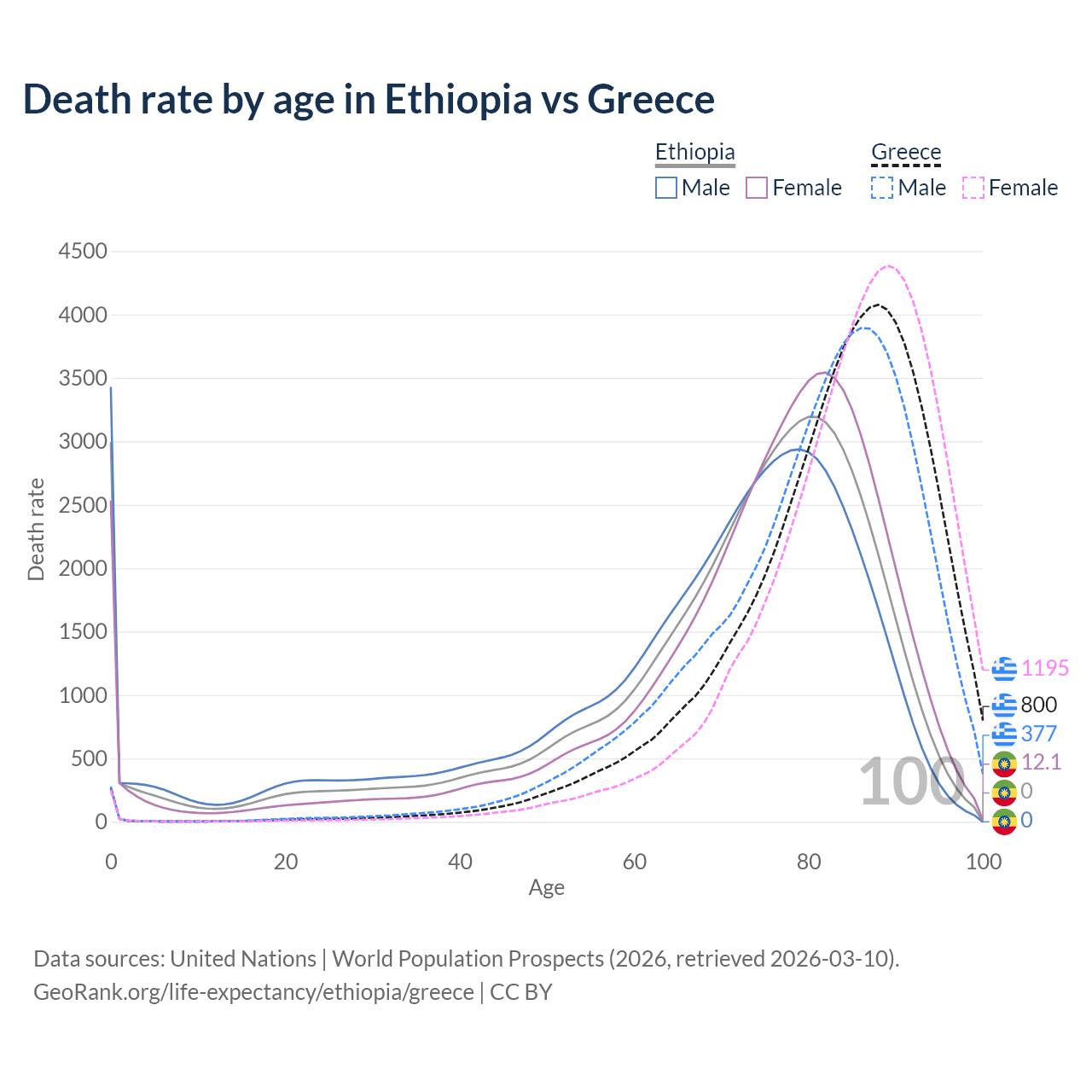 In Ethiopia, the most common age of death is 80, compared to 88 in Greece. The median age of death is 74.8 in Ethiopia and 84.9 in Greece, meaning only half of each cohort is expected to live past that age.