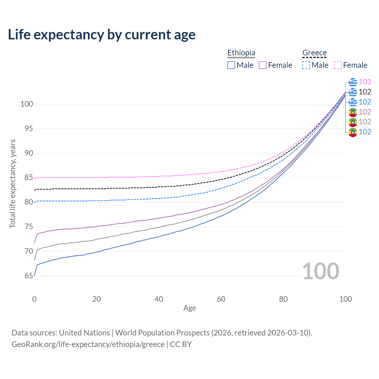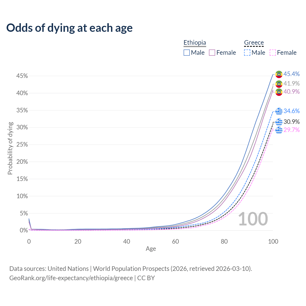 This life expectancy calculator shows the odds of living to 100, 95, 90, and below based on current age for both males and females in Ethiopia and Greece, along with mean and median age of death. The calculations are based on the 2026 life tables (actuarial tables) from the UN World Population Prospects.