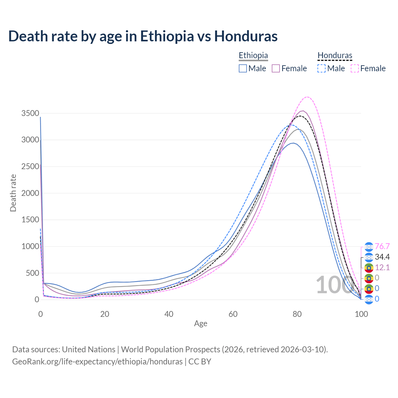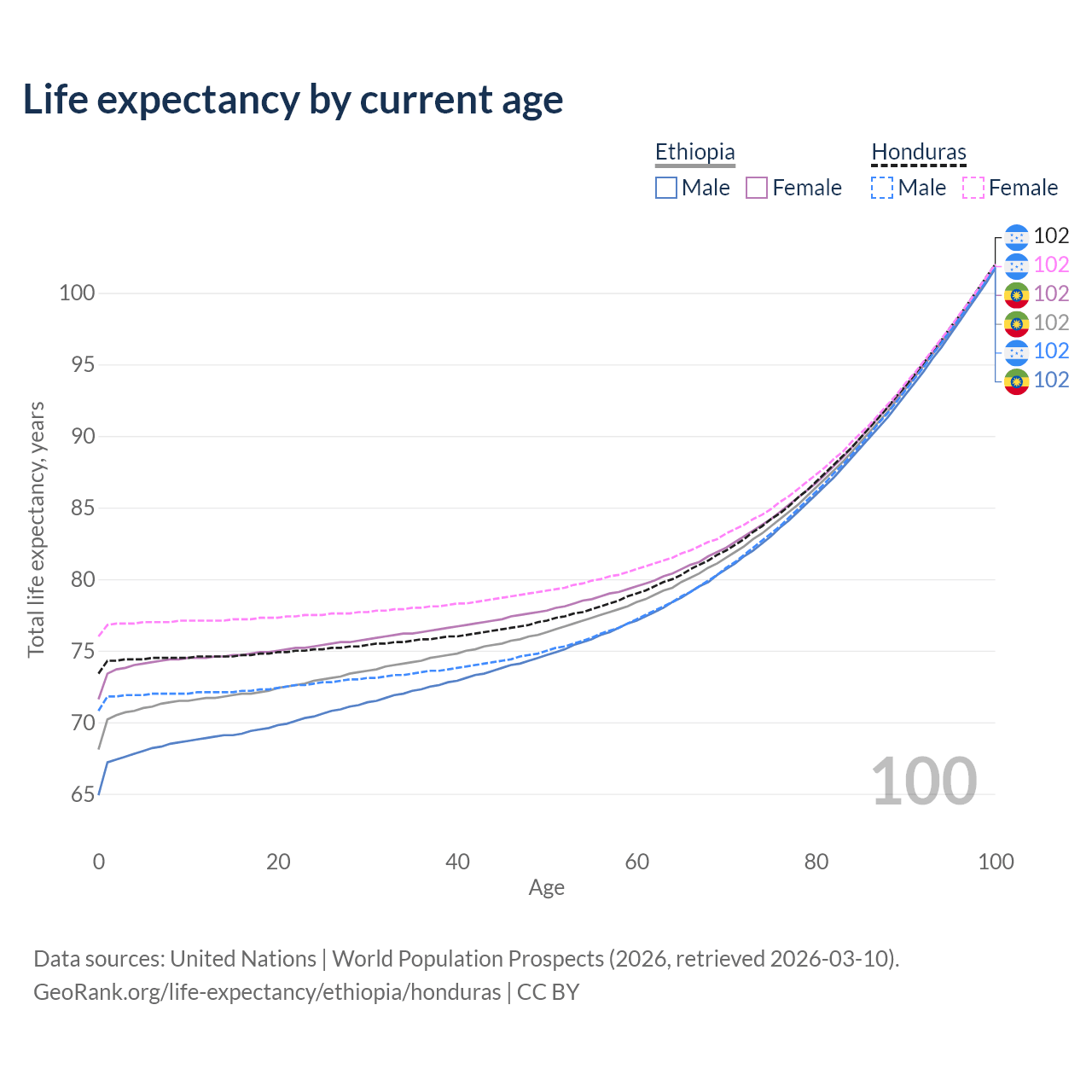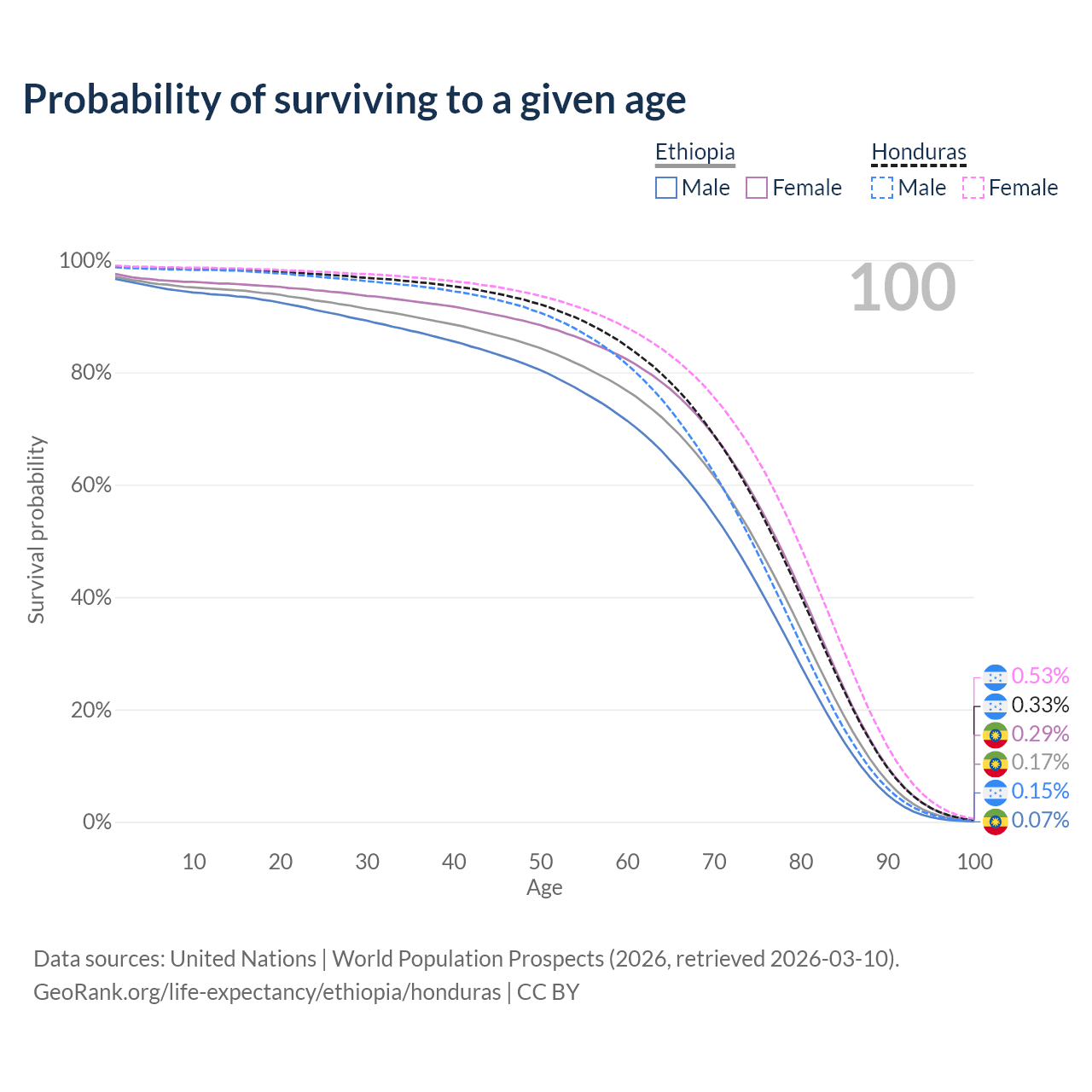 This life expectancy calculator shows the odds of living to 100, 95, 90, and below based on current age for both males and females in Ethiopia and Honduras, along with mean and median age of death. The calculations are based on the 2026 life tables (actuarial tables) from the UN World Population Prospects.