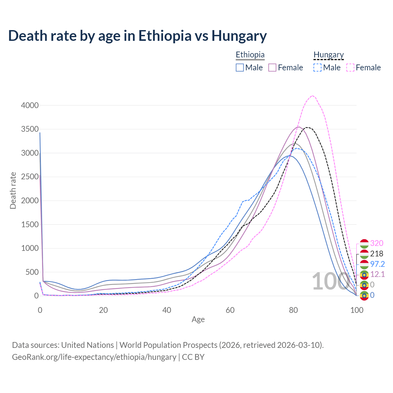 In Ethiopia, the most common age of death is 80, compared to 84 in Hungary. The median age of death is 74.8 in Ethiopia and 80.4 in Hungary, meaning only half of each cohort is expected to live past that age.