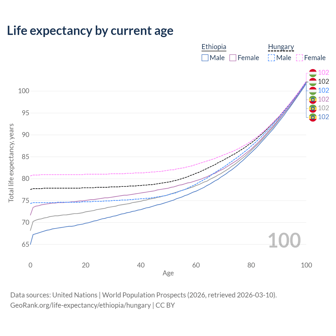 This life expectancy calculator shows the odds of living to 100, 95, 90, and below based on current age for both males and females in Ethiopia and Hungary, along with mean and median age of death. The calculations are based on the 2026 life tables (actuarial tables) from the UN World Population Prospects.