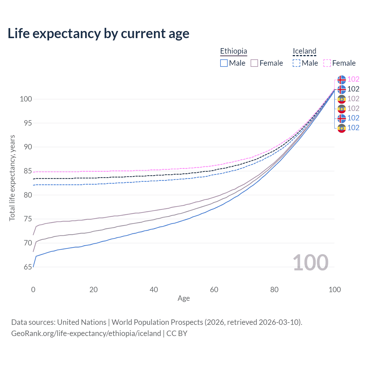 This life expectancy calculator shows the odds of living to 100, 95, 90, and below based on current age for both males and females in Ethiopia and Iceland, along with mean and median age of death. The calculations are based on the 2026 life tables (actuarial tables) from the UN World Population Prospects.