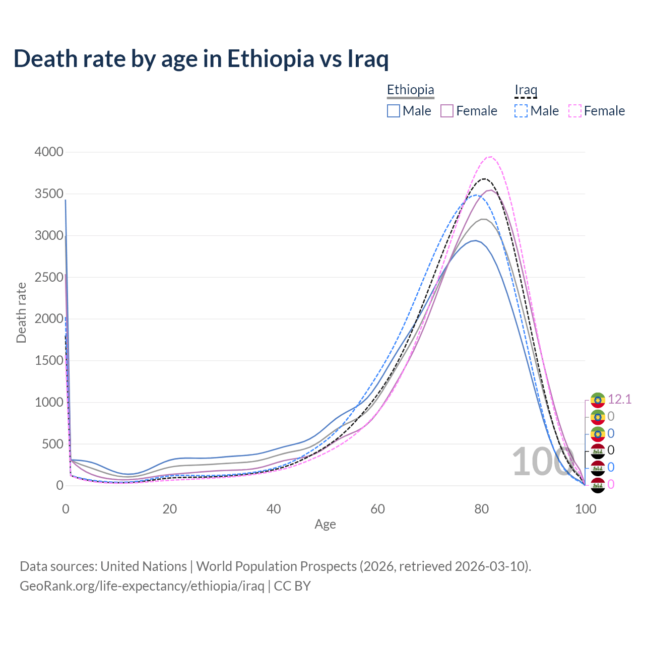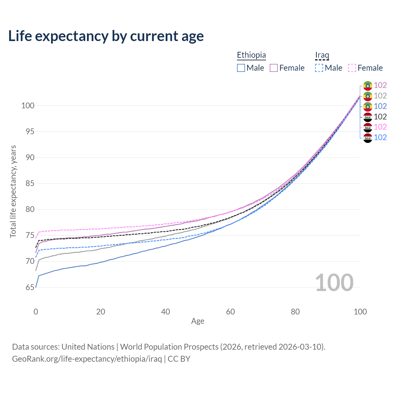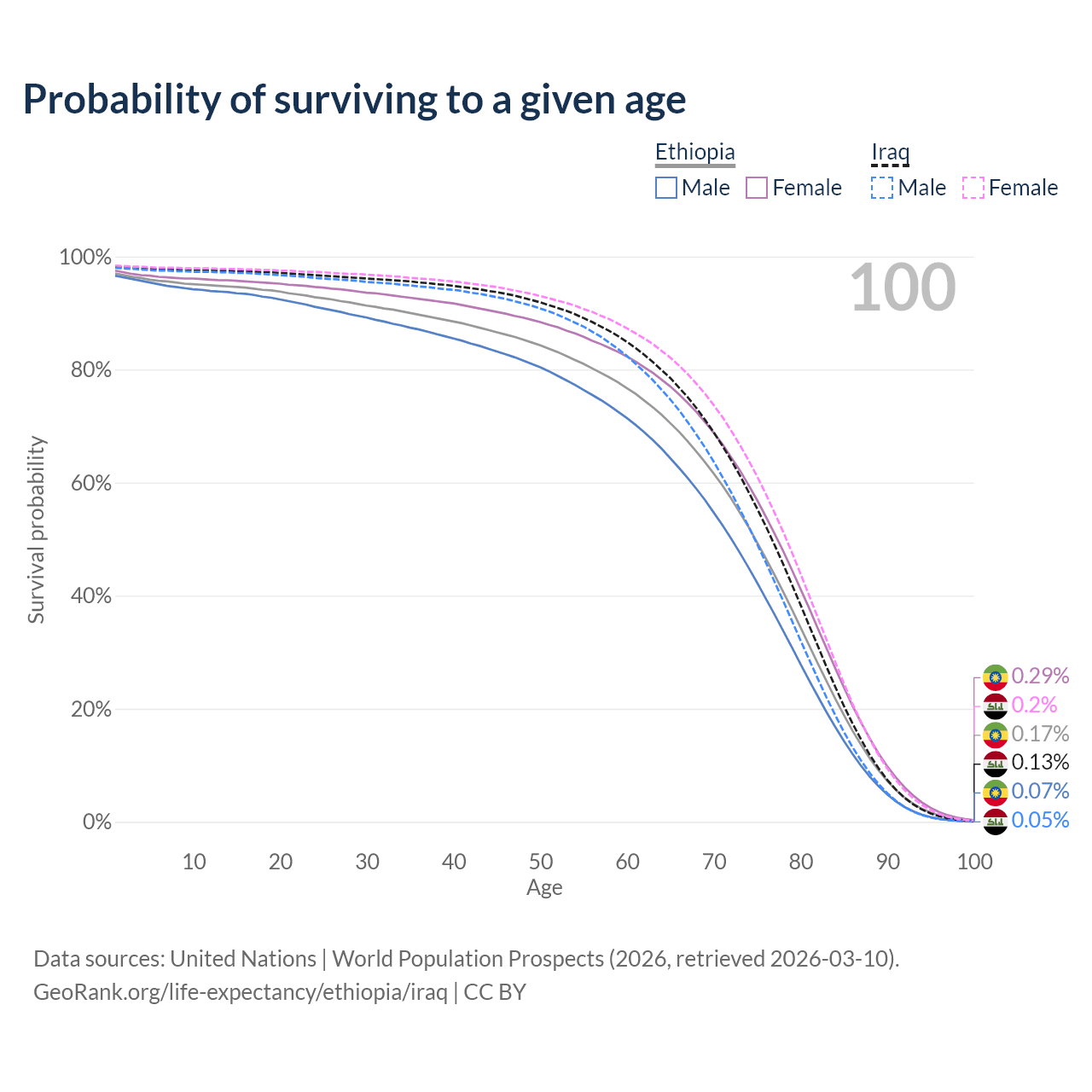 This life expectancy calculator shows the odds of living to 100, 95, 90, and below based on current age for both males and females in Ethiopia and Iraq, along with mean and median age of death. The calculations are based on the 2026 life tables (actuarial tables) from the UN World Population Prospects.