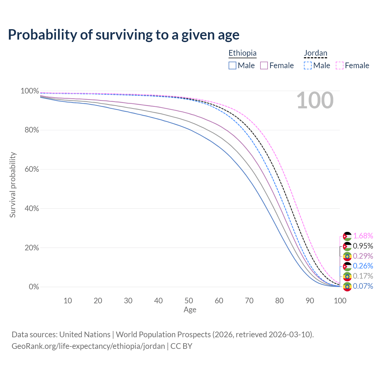 This life expectancy calculator shows the odds of living to 100, 95, 90, and below based on current age for both males and females in Ethiopia and Jordan, along with mean and median age of death. The calculations are based on the 2026 life tables (actuarial tables) from the UN World Population Prospects.