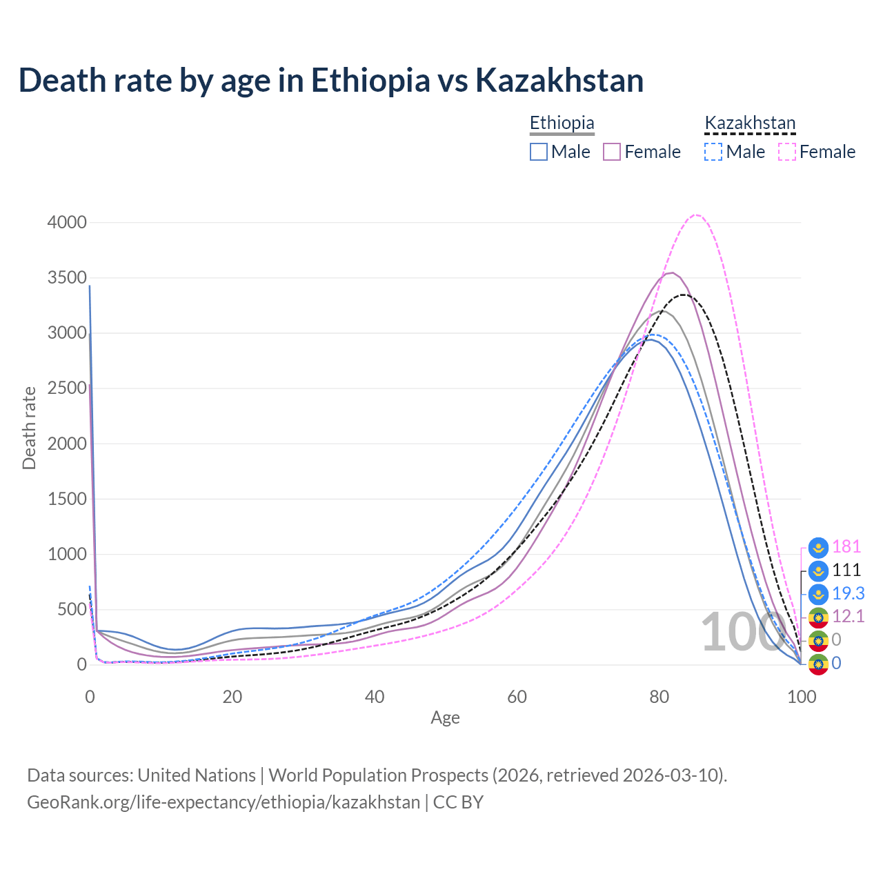 In Ethiopia, the most common age of death is 80, compared to 84 in Kazakhstan. The median age of death is 74.8 in Ethiopia and 78.6 in Kazakhstan, meaning only half of each cohort is expected to live past that age.