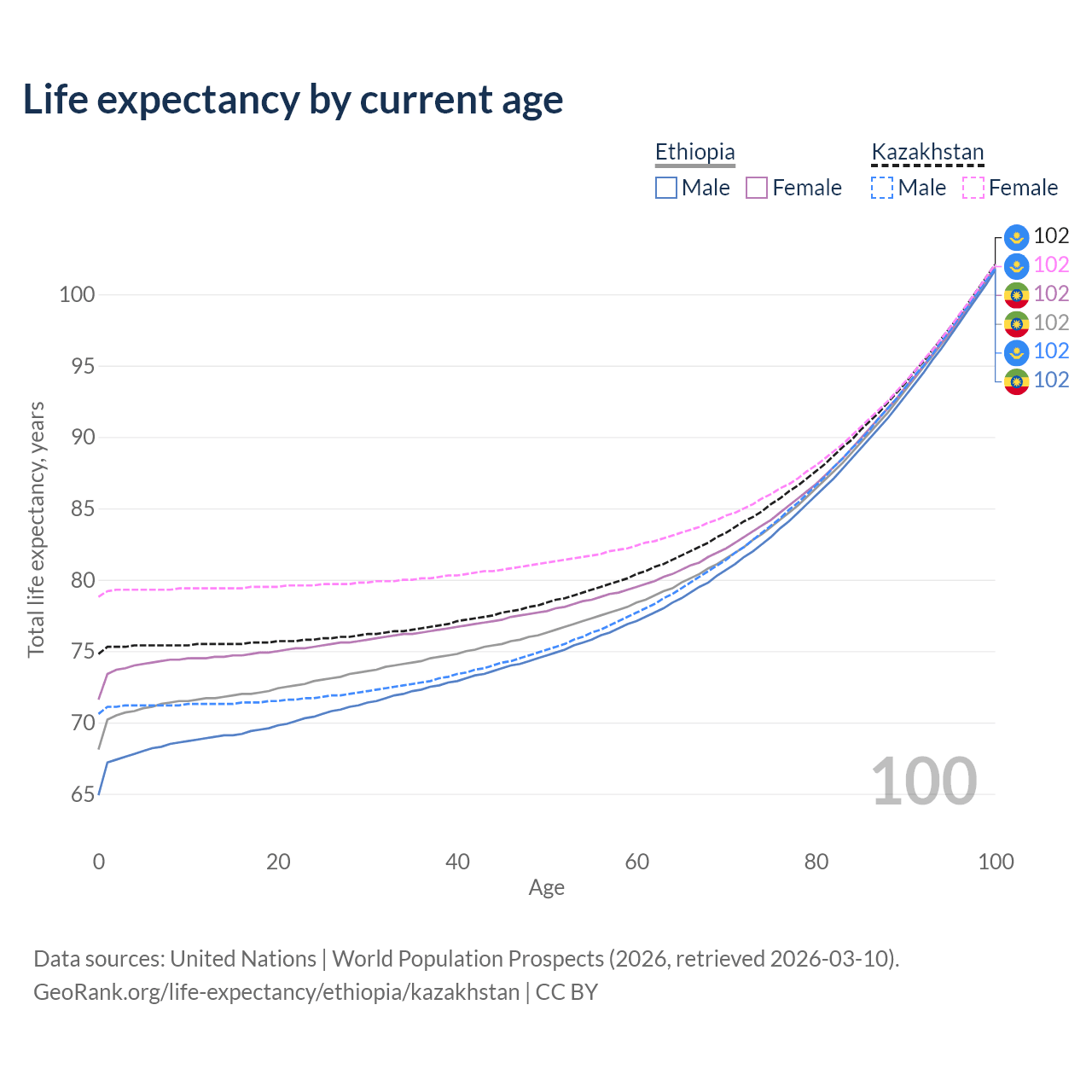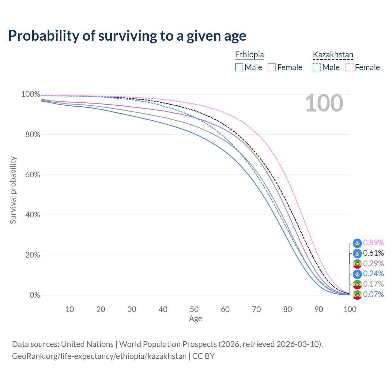 This life expectancy calculator shows the odds of living to 100, 95, 90, and below based on current age for both males and females in Ethiopia and Kazakhstan, along with mean and median age of death. The calculations are based on the 2026 life tables (actuarial tables) from the UN World Population Prospects.