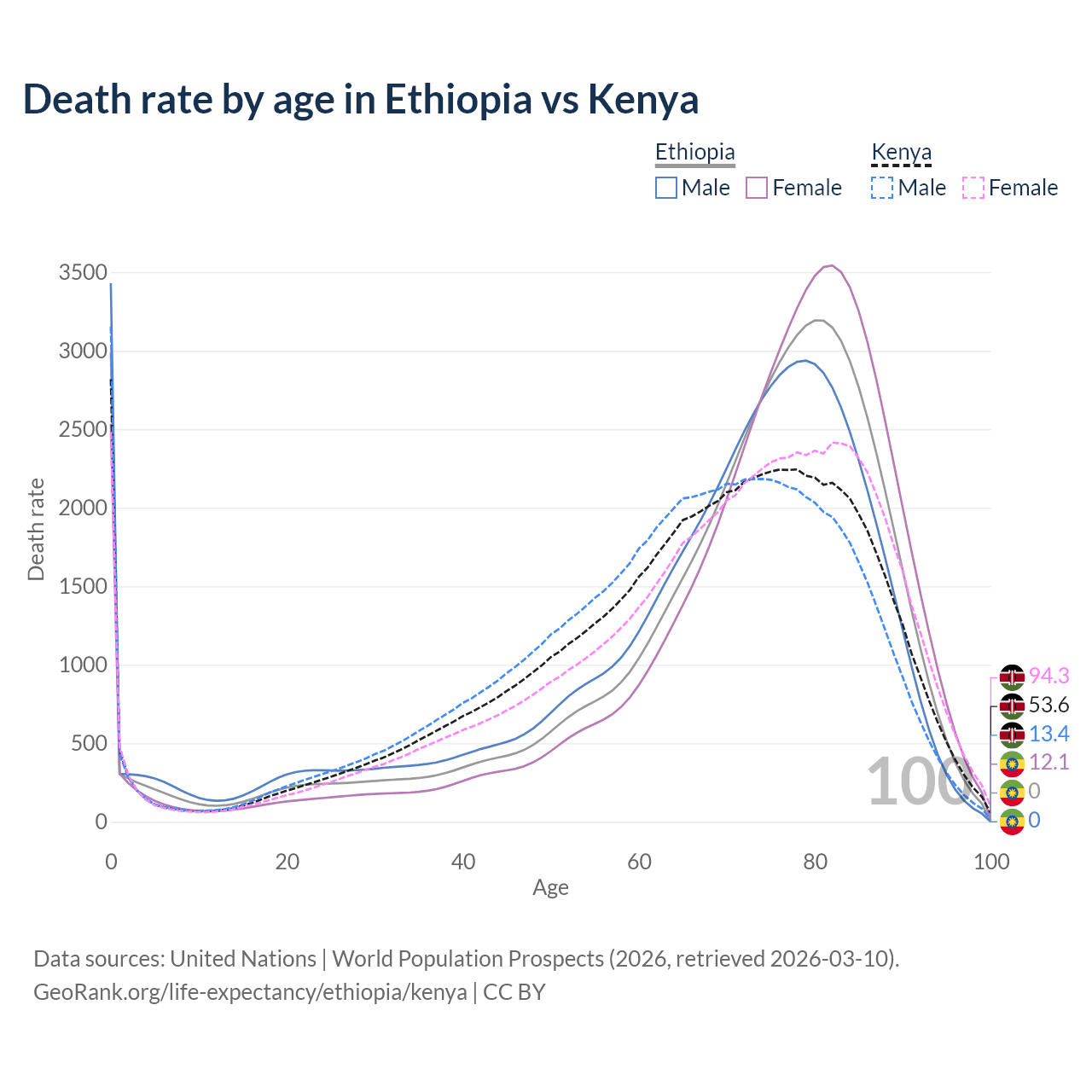 This life expectancy calculator shows the odds of living to 100, 95, 90, and below based on current age for both males and females in Ethiopia and Kenya, along with mean and median age of death. The calculations are based on the 2026 life tables (actuarial tables) from the UN World Population Prospects.