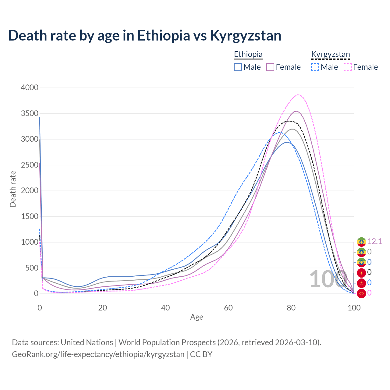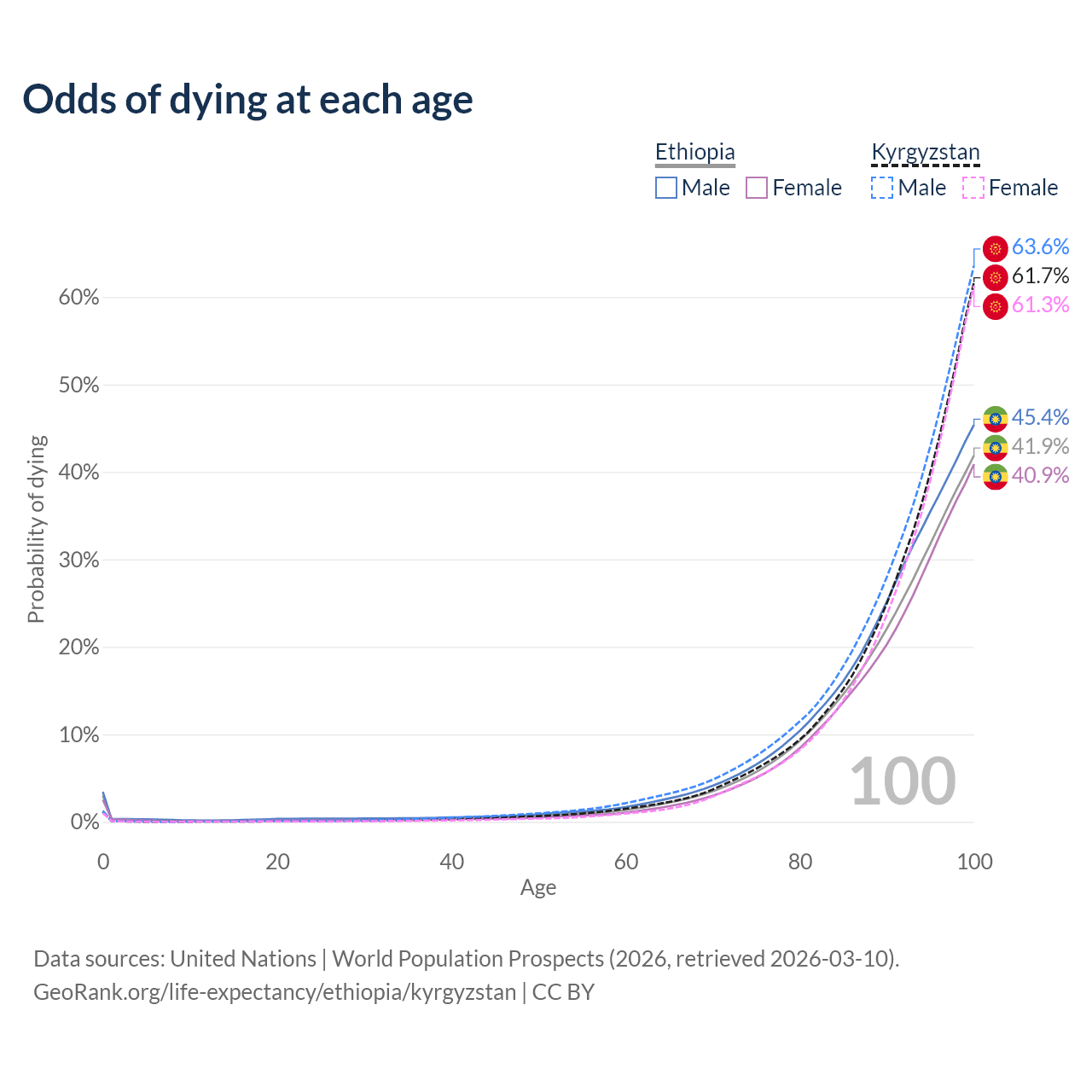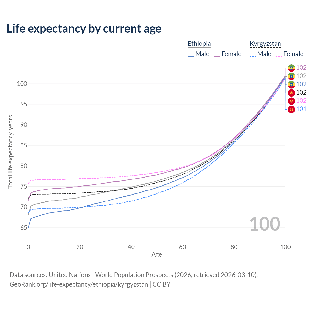 This life expectancy calculator shows the odds of living to 100, 95, 90, and below based on current age for both males and females in Ethiopia and Kyrgyzstan, along with mean and median age of death. The calculations are based on the 2026 life tables (actuarial tables) from the UN World Population Prospects.