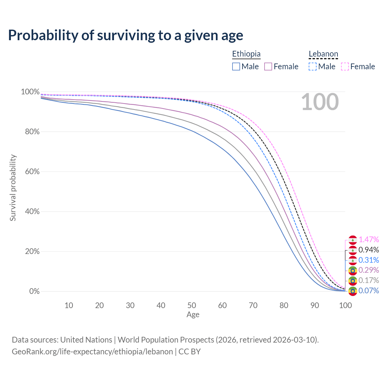 This life expectancy calculator shows the odds of living to 100, 95, 90, and below based on current age for both males and females in Ethiopia and Lebanon, along with mean and median age of death. The calculations are based on the 2026 life tables (actuarial tables) from the UN World Population Prospects.