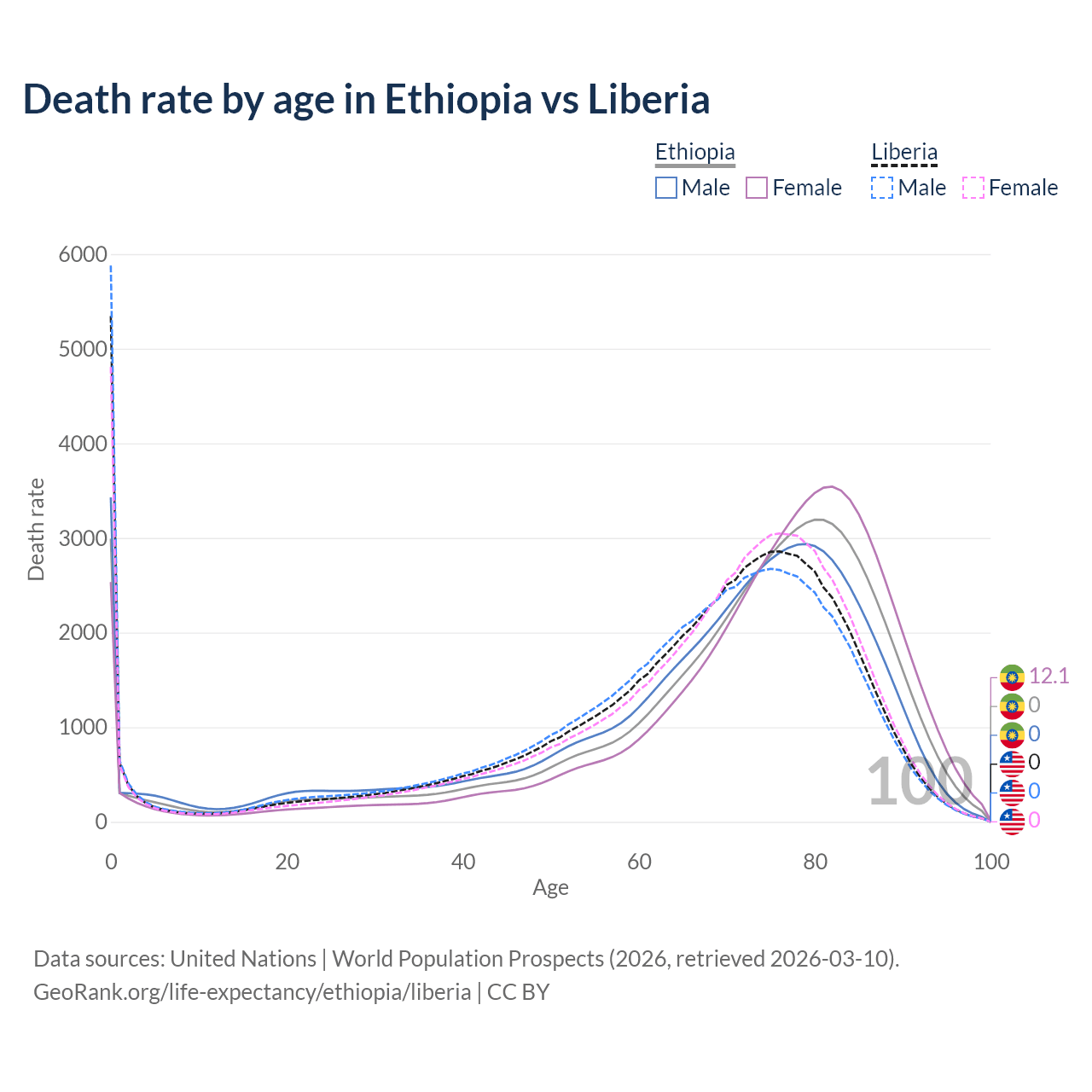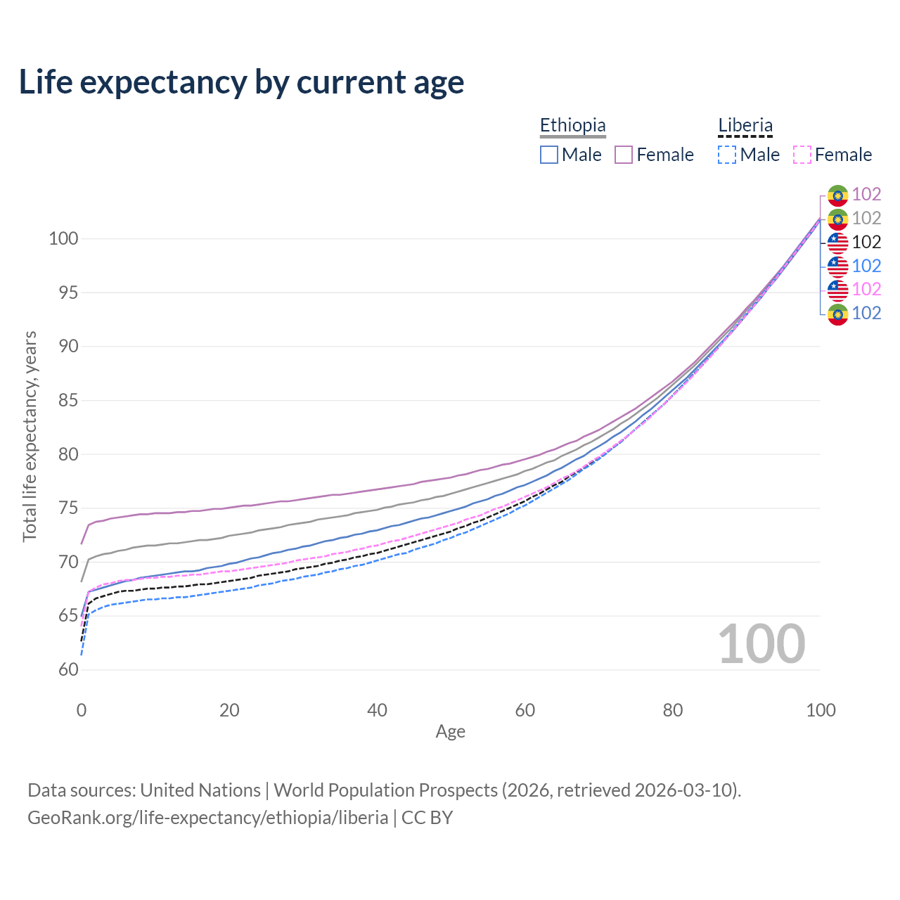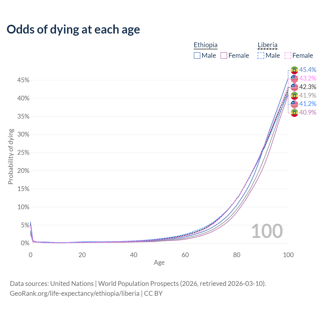 This life expectancy calculator shows the odds of living to 100, 95, 90, and below based on current age for both males and females in Ethiopia and Liberia, along with mean and median age of death. The calculations are based on the 2026 life tables (actuarial tables) from the UN World Population Prospects.