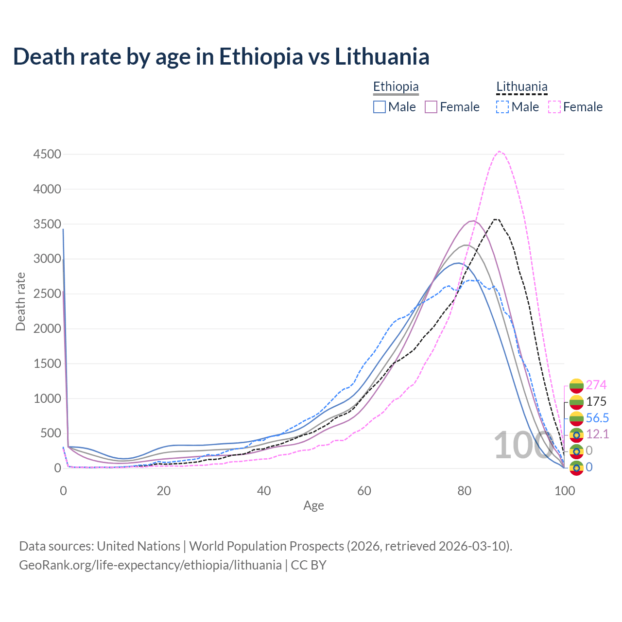 This life expectancy calculator shows the odds of living to 100, 95, 90, and below based on current age for both males and females in Ethiopia and Lithuania, along with mean and median age of death. The calculations are based on the 2026 life tables (actuarial tables) from the UN World Population Prospects.