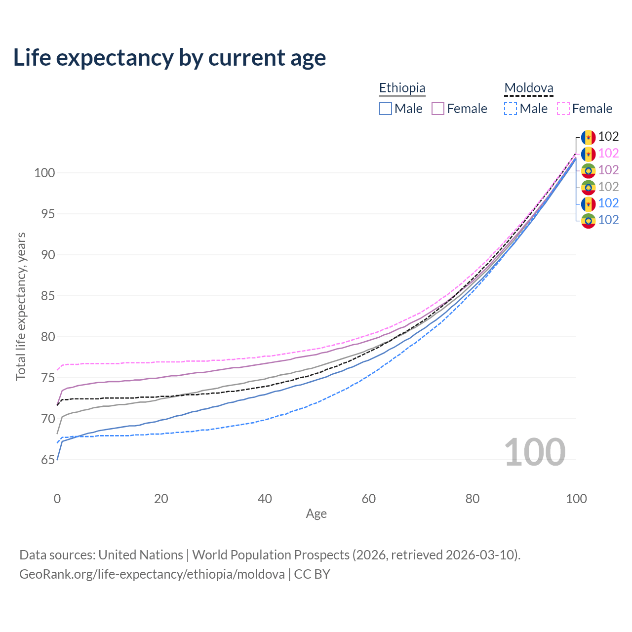 This life expectancy calculator shows the odds of living to 100, 95, 90, and below based on current age for both males and females in Ethiopia and Moldova, along with mean and median age of death. The calculations are based on the 2026 life tables (actuarial tables) from the UN World Population Prospects.