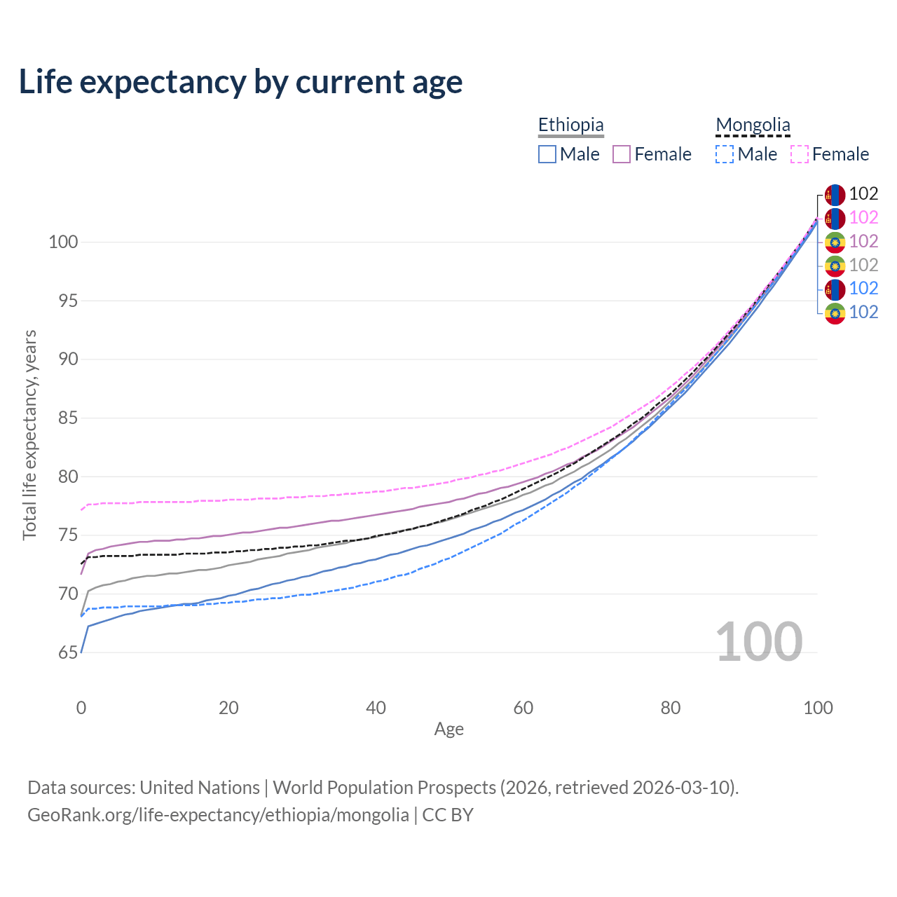 This life expectancy calculator shows the odds of living to 100, 95, 90, and below based on current age for both males and females in Ethiopia and Mongolia, along with mean and median age of death. The calculations are based on the 2026 life tables (actuarial tables) from the UN World Population Prospects.