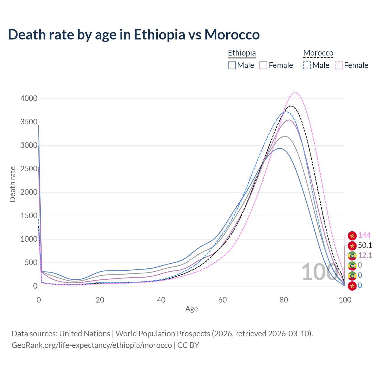 This life expectancy calculator shows the odds of living to 100, 95, 90, and below based on current age for both males and females in Ethiopia and Morocco, along with mean and median age of death. The calculations are based on the 2026 life tables (actuarial tables) from the UN World Population Prospects.