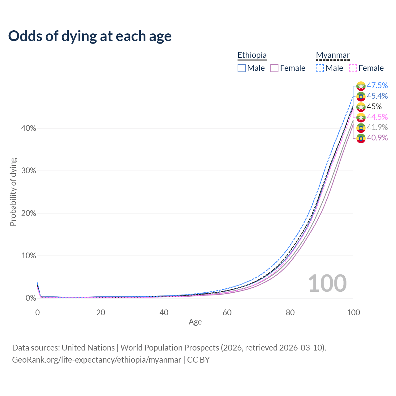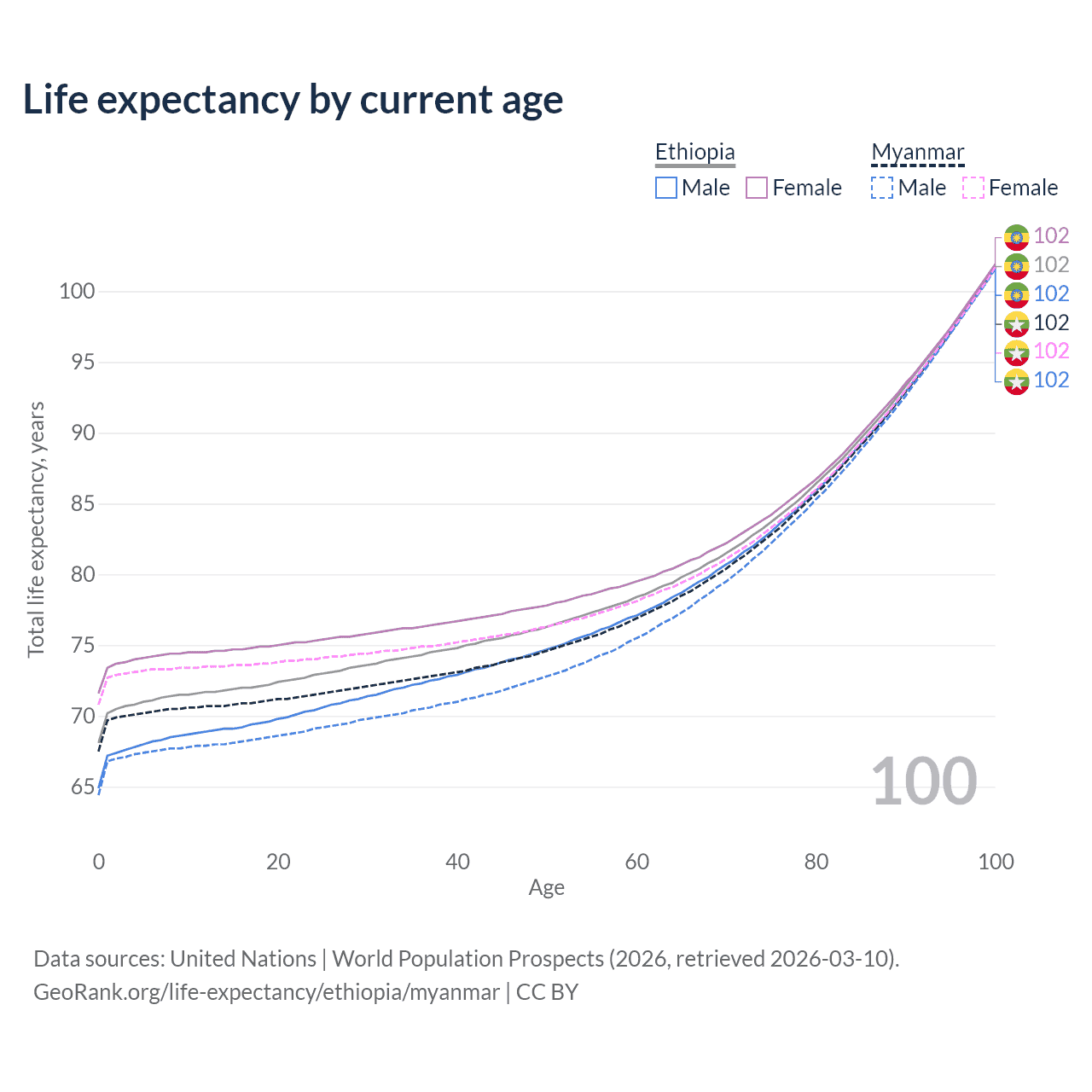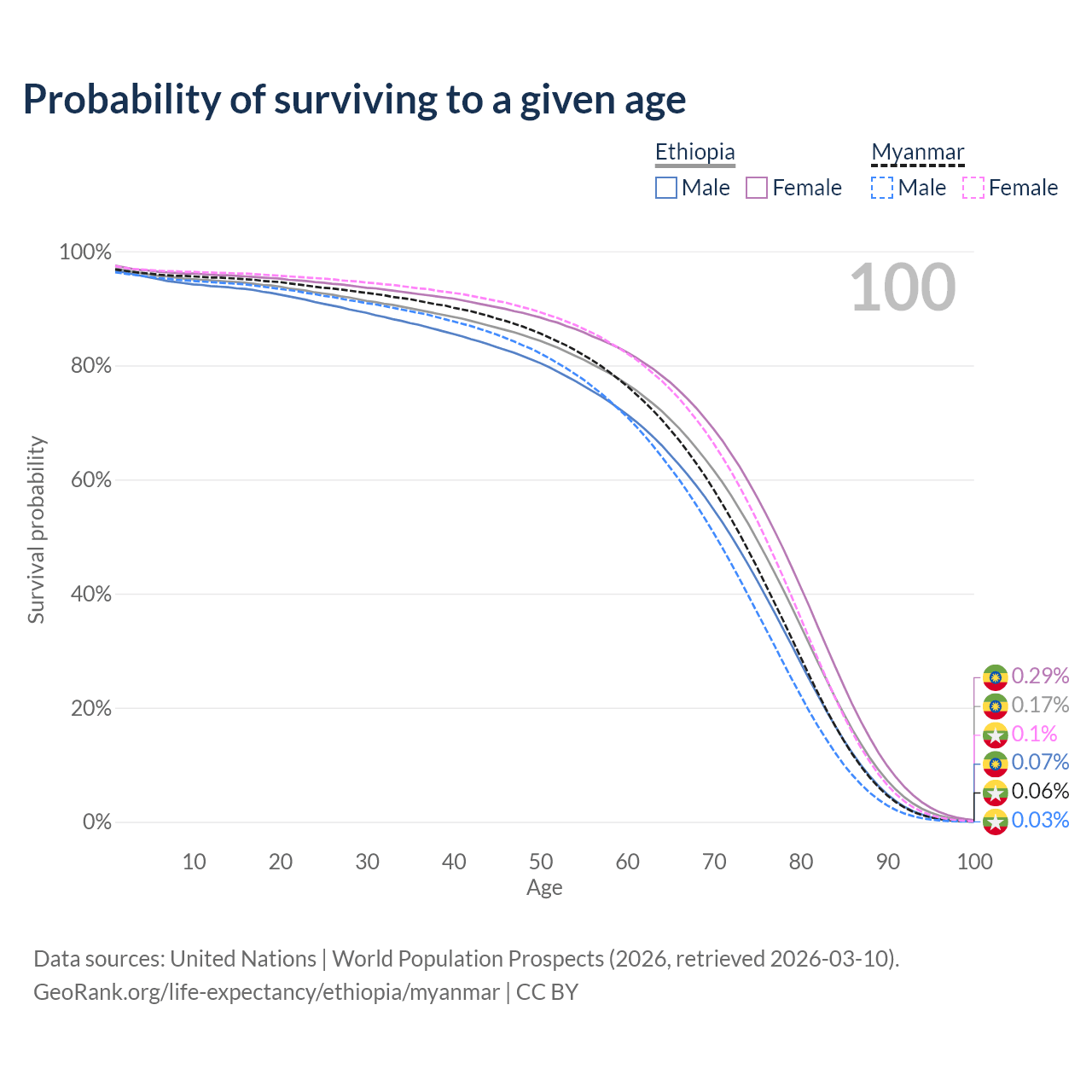 This life expectancy calculator shows the odds of living to 100, 95, 90, and below based on current age for both males and females in Ethiopia and Myanmar, along with mean and median age of death. The calculations are based on the 2026 life tables (actuarial tables) from the UN World Population Prospects.