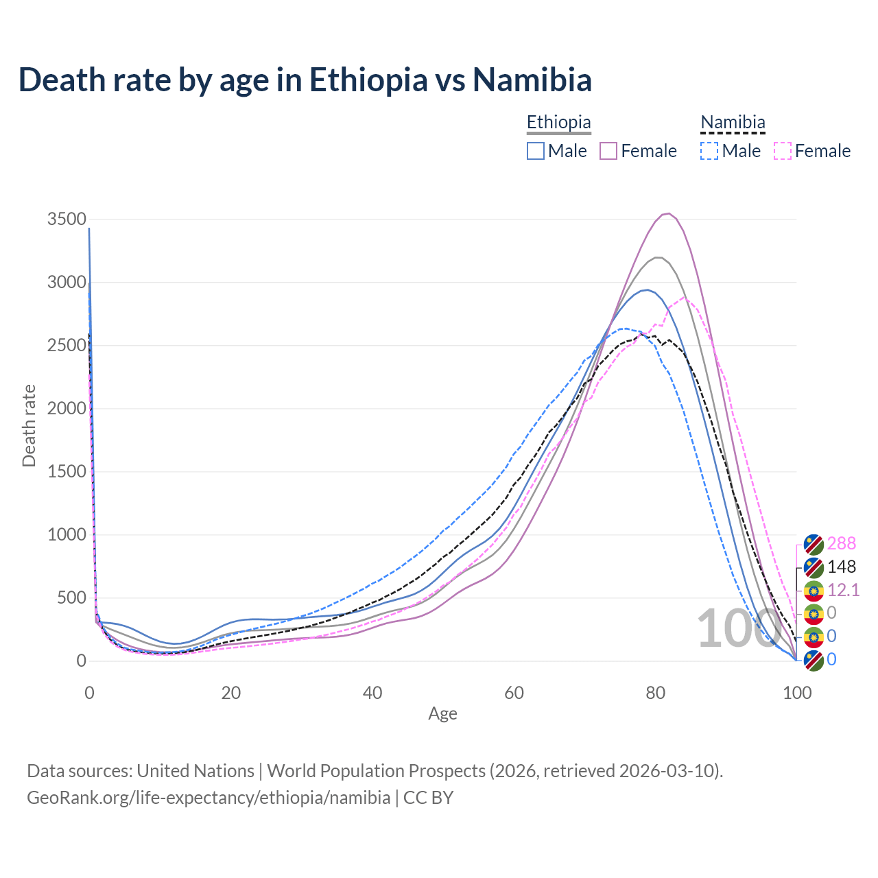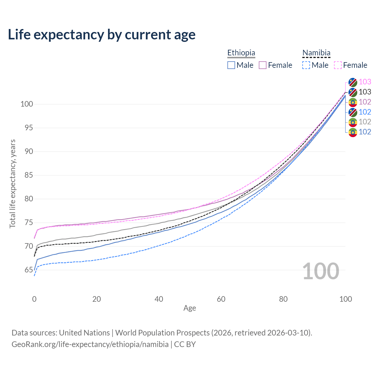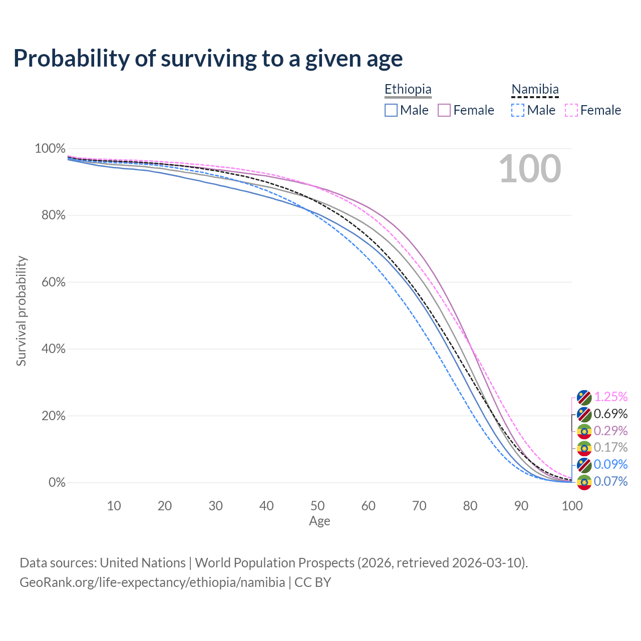 This life expectancy calculator shows the odds of living to 100, 95, 90, and below based on current age for both males and females in Ethiopia and Namibia, along with mean and median age of death. The calculations are based on the 2026 life tables (actuarial tables) from the UN World Population Prospects.