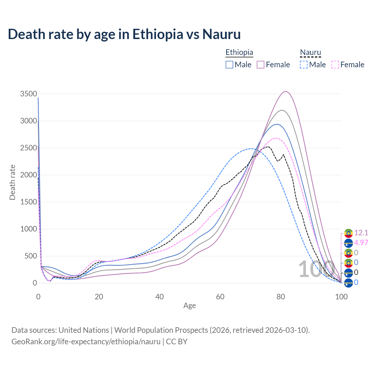 In Ethiopia, the most common age of death is 80, compared to 76 in Nauru. The median age of death is 74.8 in Ethiopia and 67.3 in Nauru, meaning only half of each cohort is expected to live past that age.