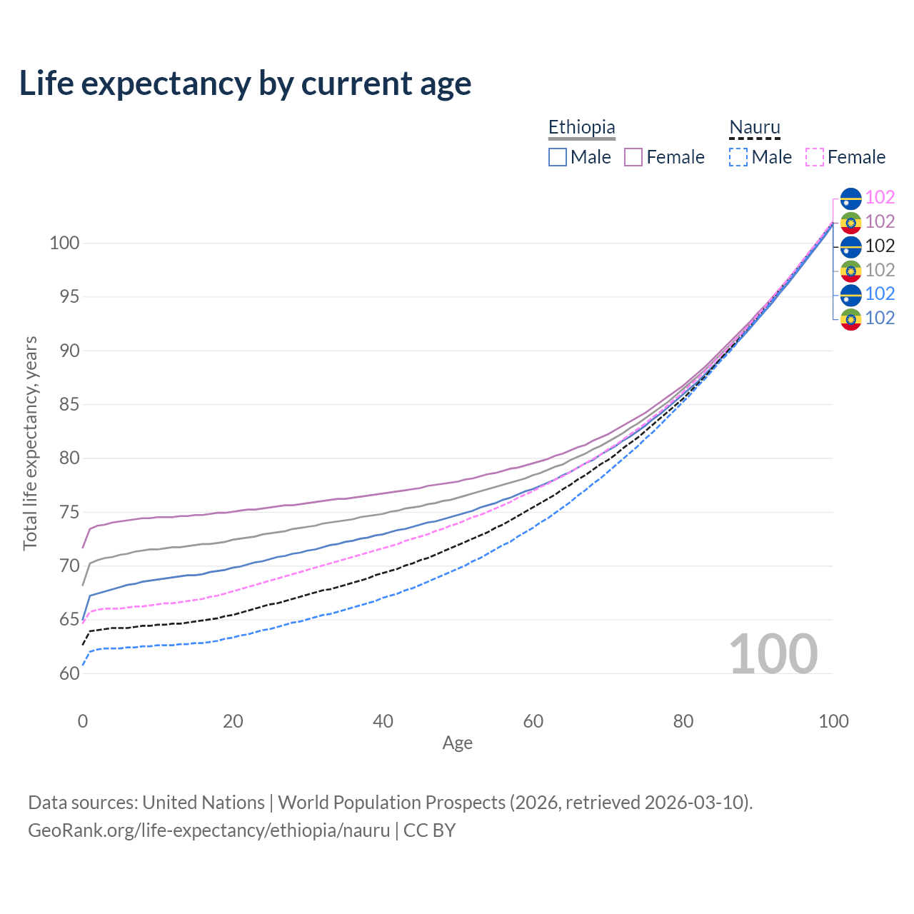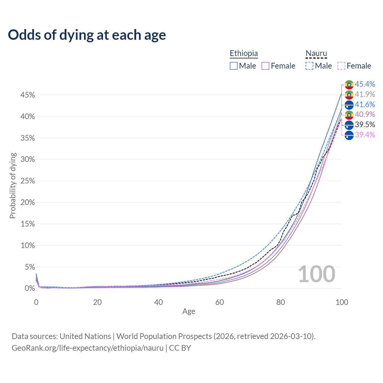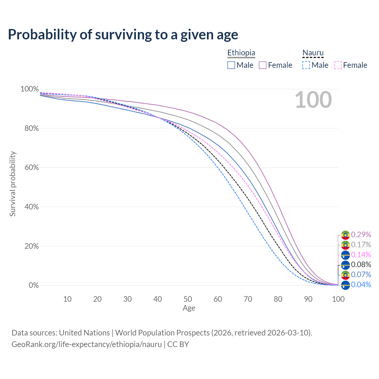 This life expectancy calculator shows the odds of living to 100, 95, 90, and below based on current age for both males and females in Ethiopia and Nauru, along with mean and median age of death. The calculations are based on the 2026 life tables (actuarial tables) from the UN World Population Prospects.
