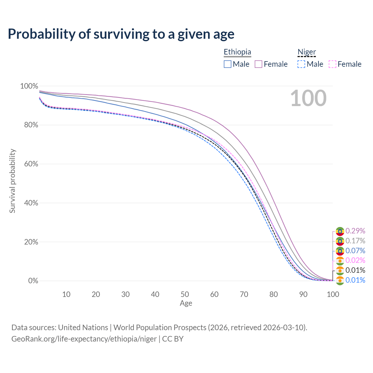 This life expectancy calculator shows the odds of living to 100, 95, 90, and below based on current age for both males and females in Ethiopia and Niger, along with mean and median age of death. The calculations are based on the 2026 life tables (actuarial tables) from the UN World Population Prospects.