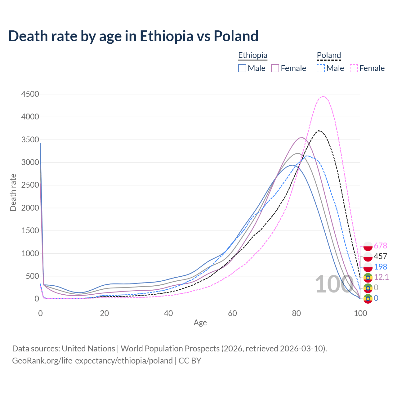 In Ethiopia, the most common age of death is 80, compared to 87 in Poland. The median age of death is 74.8 in Ethiopia and 82.5 in Poland, meaning only half of each cohort is expected to live past that age.