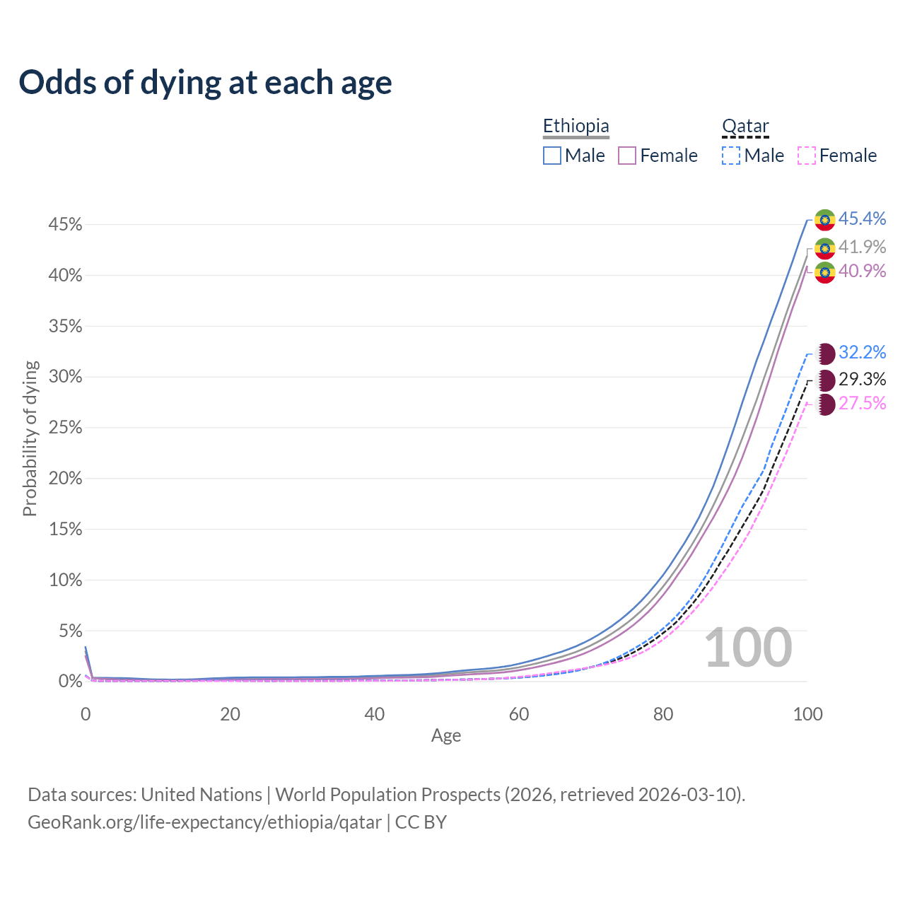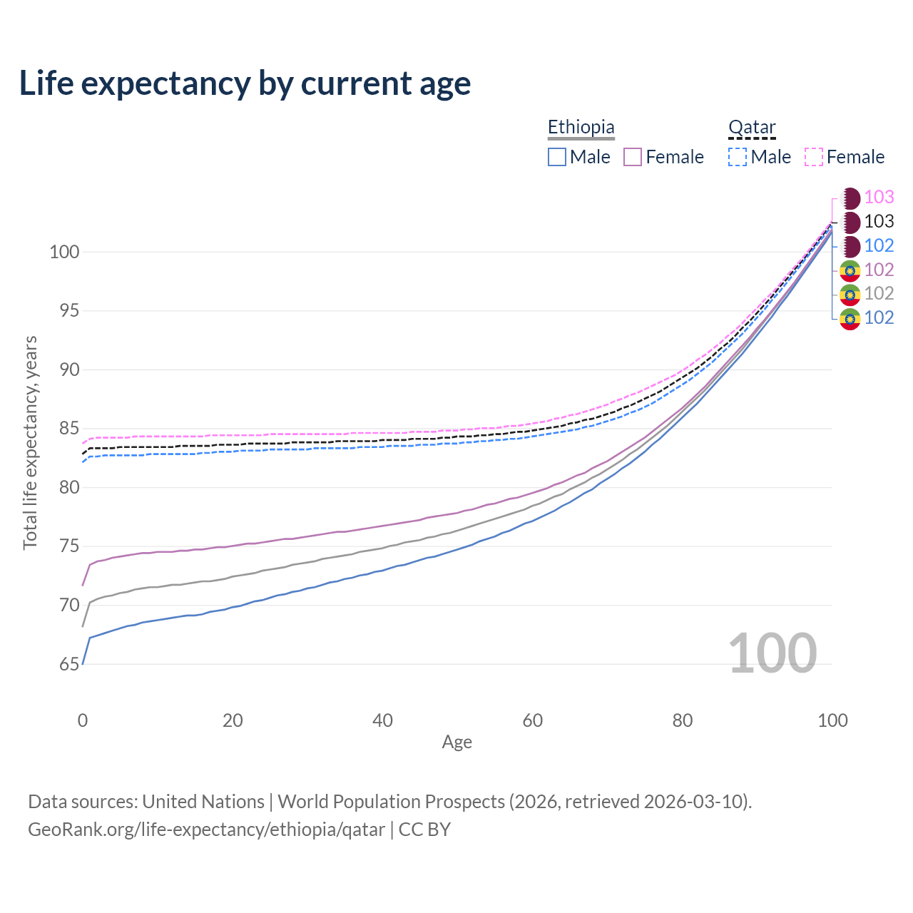 This life expectancy calculator shows the odds of living to 100, 95, 90, and below based on current age for both males and females in Ethiopia and Qatar, along with mean and median age of death. The calculations are based on the 2026 life tables (actuarial tables) from the UN World Population Prospects.