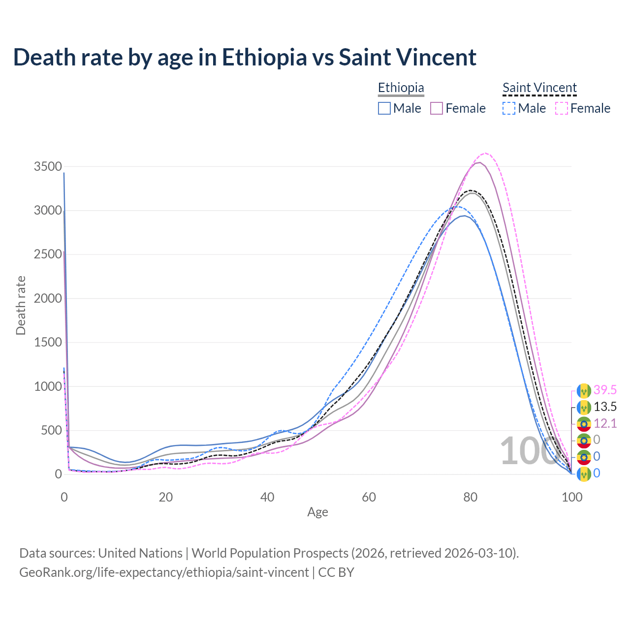 In Ethiopia, the most common age of death is 80, compared to 80 in Saint Vincent. The median age of death is 74.8 in Ethiopia and 75.6 in Saint Vincent, meaning only half of each cohort is expected to live past that age.