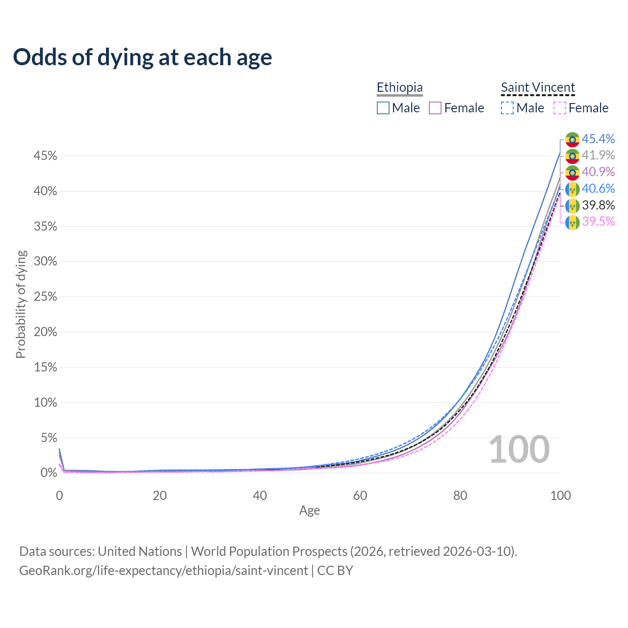 This life expectancy calculator shows the odds of living to 100, 95, 90, and below based on current age for both males and females in Ethiopia and Saint Vincent, along with mean and median age of death. The calculations are based on the 2026 life tables (actuarial tables) from the UN World Population Prospects.