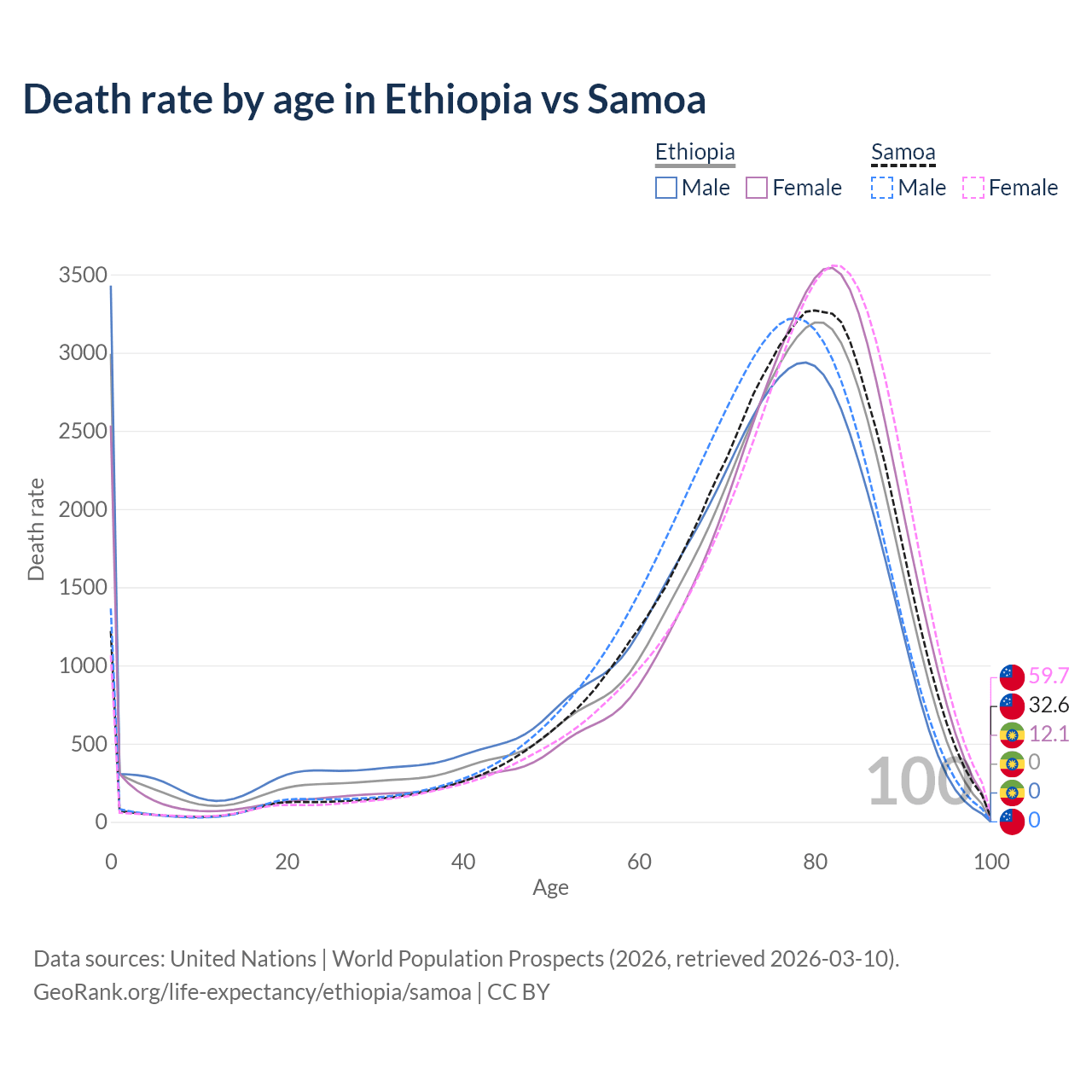This life expectancy calculator shows the odds of living to 100, 95, 90, and below based on current age for both males and females in Ethiopia and Samoa, along with mean and median age of death. The calculations are based on the 2026 life tables (actuarial tables) from the UN World Population Prospects.