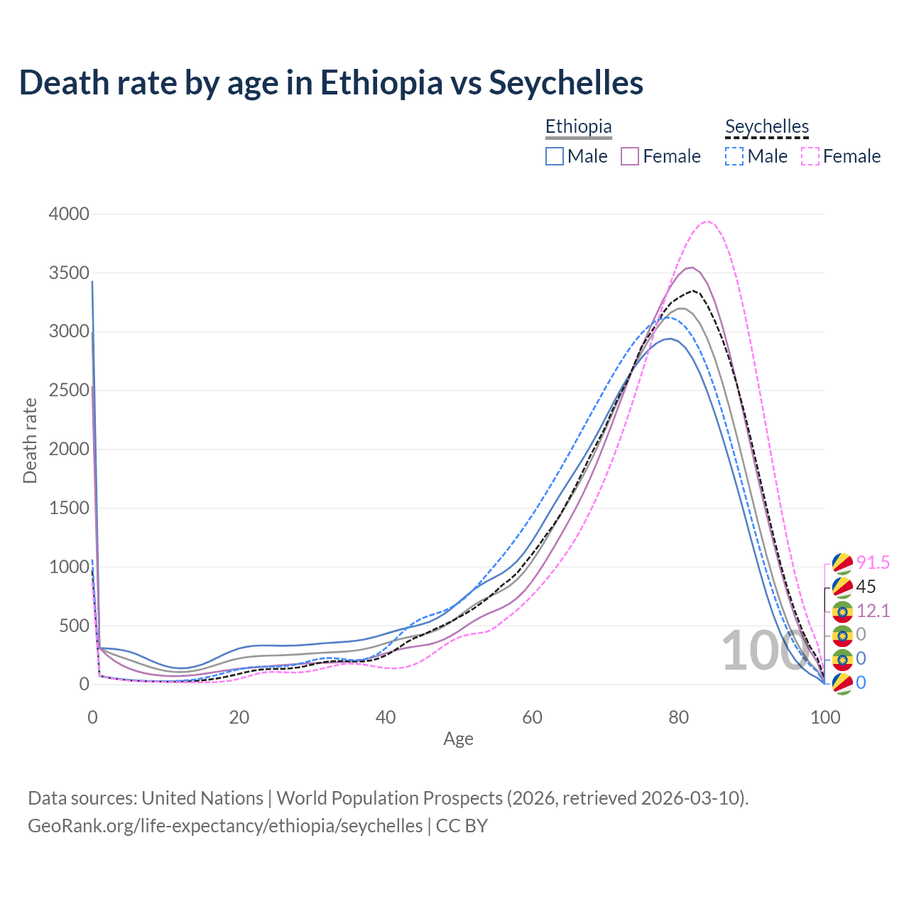 This life expectancy calculator shows the odds of living to 100, 95, 90, and below based on current age for both males and females in Ethiopia and the Seychelles, along with mean and median age of death. The calculations are based on the 2026 life tables (actuarial tables) from the UN World Population Prospects.
