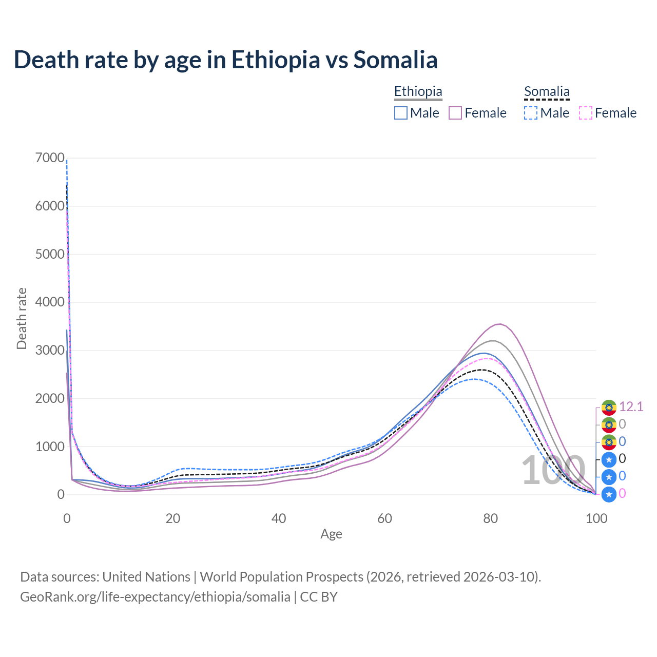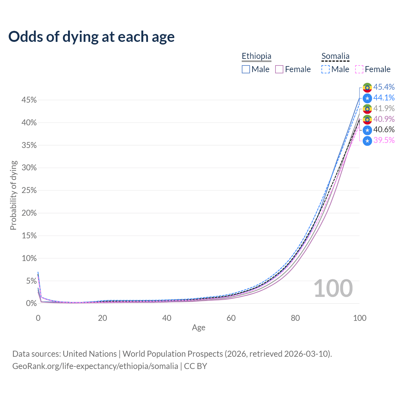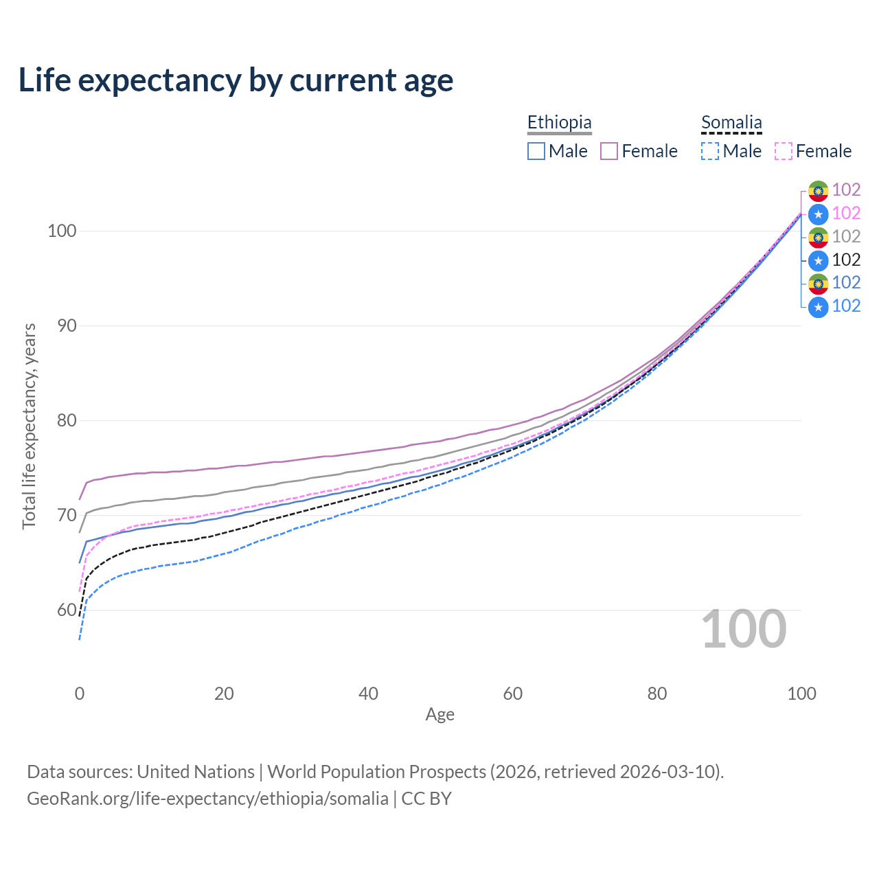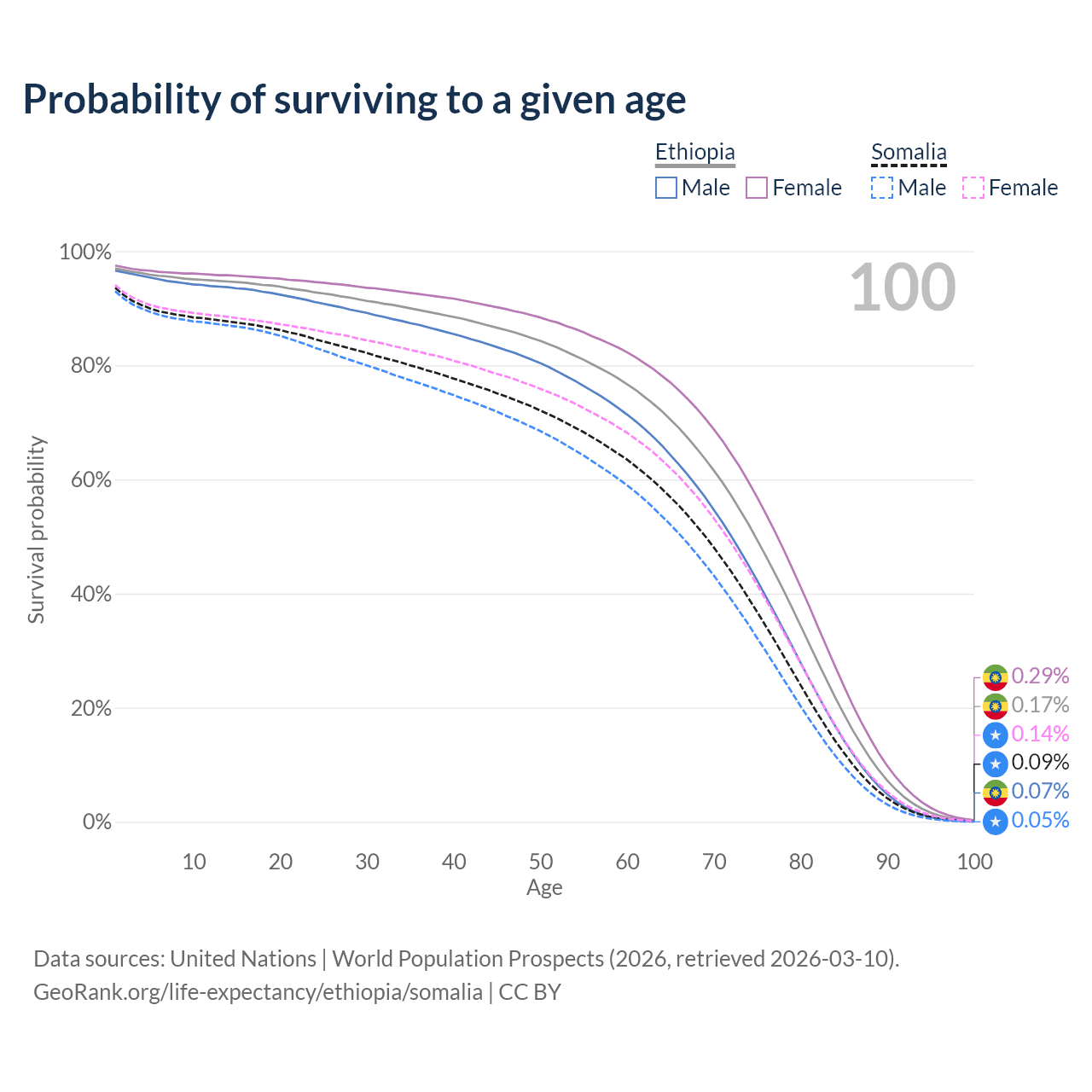 This life expectancy calculator shows the odds of living to 100, 95, 90, and below based on current age for both males and females in Ethiopia and Somalia, along with mean and median age of death. The calculations are based on the 2026 life tables (actuarial tables) from the UN World Population Prospects.